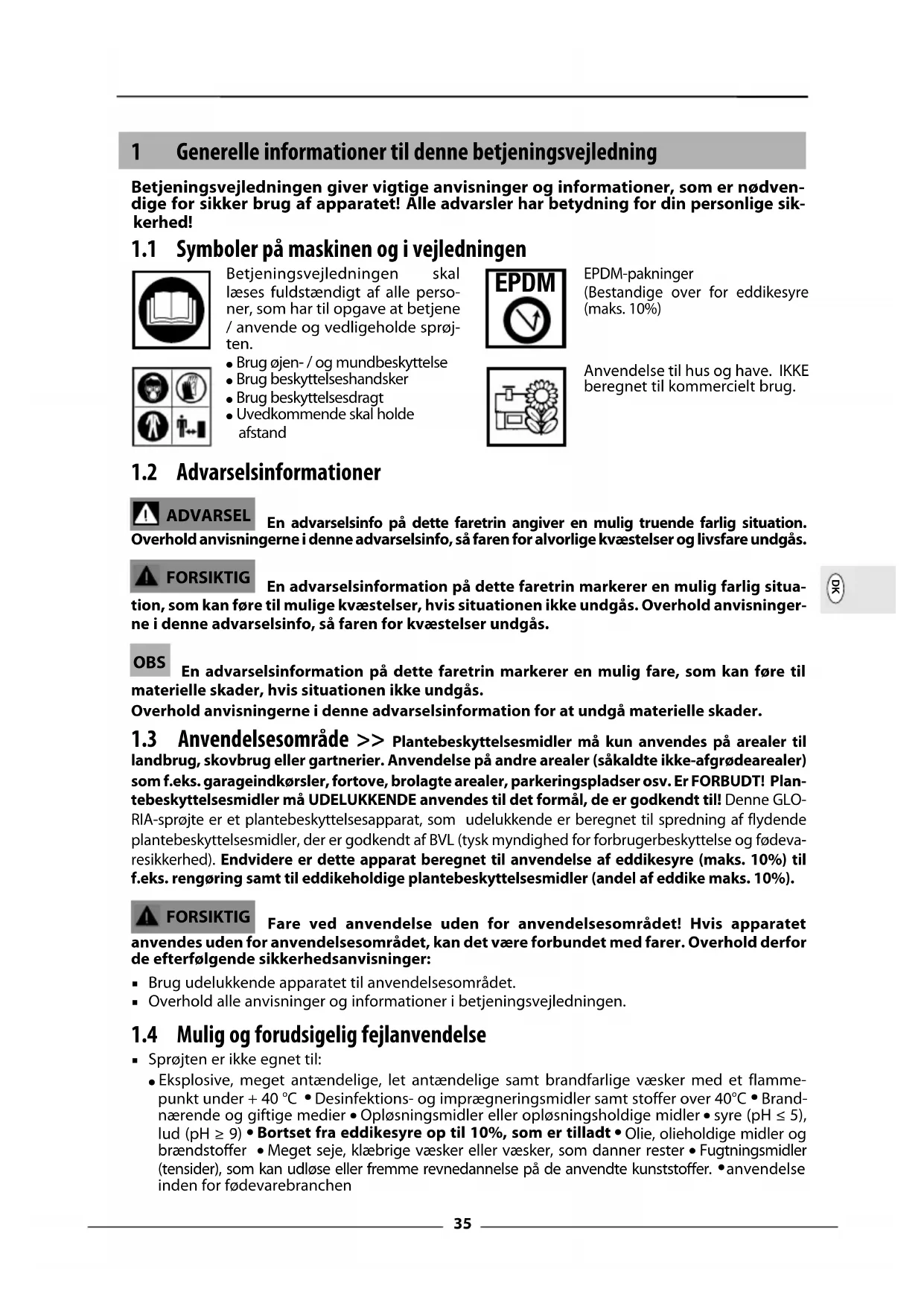landbrug, skovbrug eller gartnerier. Anvendelse på andre arealer (såkaldte ikke-afgrødearealer) som f.eks. garageindkørsler, fortove, brolagte arealer, parkeringspladser osv. Er FORBUDT! Plan- tebeskyttelsesmidler må UDELUKKENDE anvendes til det formål, de er godkendt til! Denne GLO- RIA-sprøjte er et plantebeskyttelsesapparat, som udelukkende er beregnet til spredning af flydende plantebeskyttelsesmidler, der er godkendt af BVL (tysk myndighed for forbrugerbeskyttelse og fødeva- resikkerhed). Endvidere er dette apparat beregnet til anvendelse af eddikesyre (maks. 10%) til f.eks. rengøring samt til eddikeholdige plantebeskyttelsesmidler (andel af eddike maks. 10%).