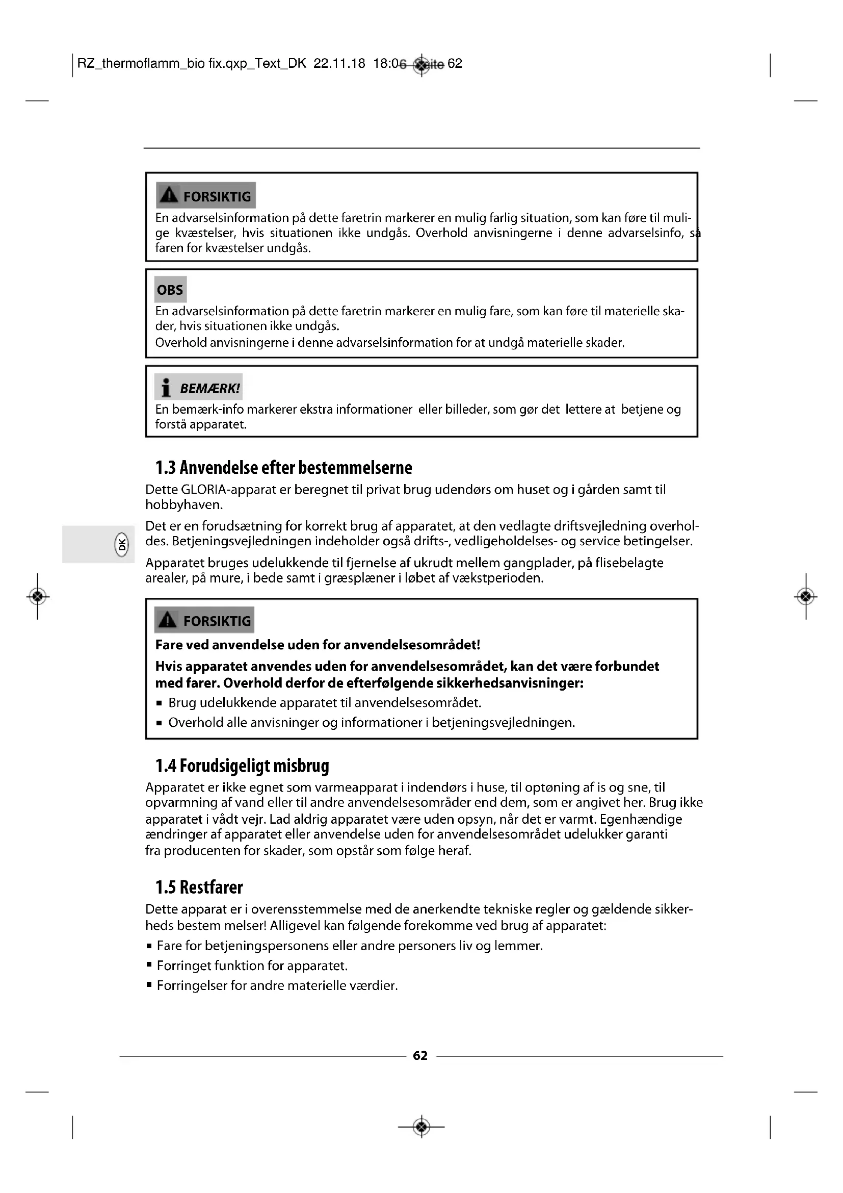 Overhold de efterfølgende grundlæggende sikkerhedsanvisninger for sikker omgang med og sikker brug af apparatet: BEMÆRK! Reparationer på apparater til hus og have må kun udføres af serviceafdelingerne. Reservedelene skal bestilles hos forhand- leren. Hvis de ikke er på lager, bestiller han dem hurtigt hjem. Dette apparat er i overensstemmelse med de anerkendte tek- niske regler og gældende sikkerhedsbestemmelser! Dette apparat kan bruges af børn fra 16 år og derover samt af personer med reducerede fysiske, sensoriske eller mentale evner eller mangel på erfaring og viden, hvis de er under opsyn eller er blevet undervist i sikker brug af apparatet og de farer, der kan være forbundet med det. Børn må ikke lege med apparatet. Rengøring og brugervedligeholdelse må ikke udføres af børn uden opsyn. Dette apparat må ikke benyttes, hvis du er træt, syg eller påvirket af alkohol, narkotika eller medicin. Det er nødvendigt at bære faste sko og sikkerhedshandsker! Apparatet må ikke være uden opsyn, så længe det er i drift eller ikke er kølet af. Unge under 16 år samt personer, som ikke har læst betje- ningsvejledningen, må ikke bruge dette apparat. For at undgå skader på grund af anvendelse uden for anven- delses området skal betjenings vejledningen overholdes og opbevares omhyggeligt! Hvis apparatet gives videre til andre personer, skal betjenings- vejledningen følge med! RZ_thermoflamm_bio fix.qxp_Text_DK 22.11.18 18:06 Seite 6364