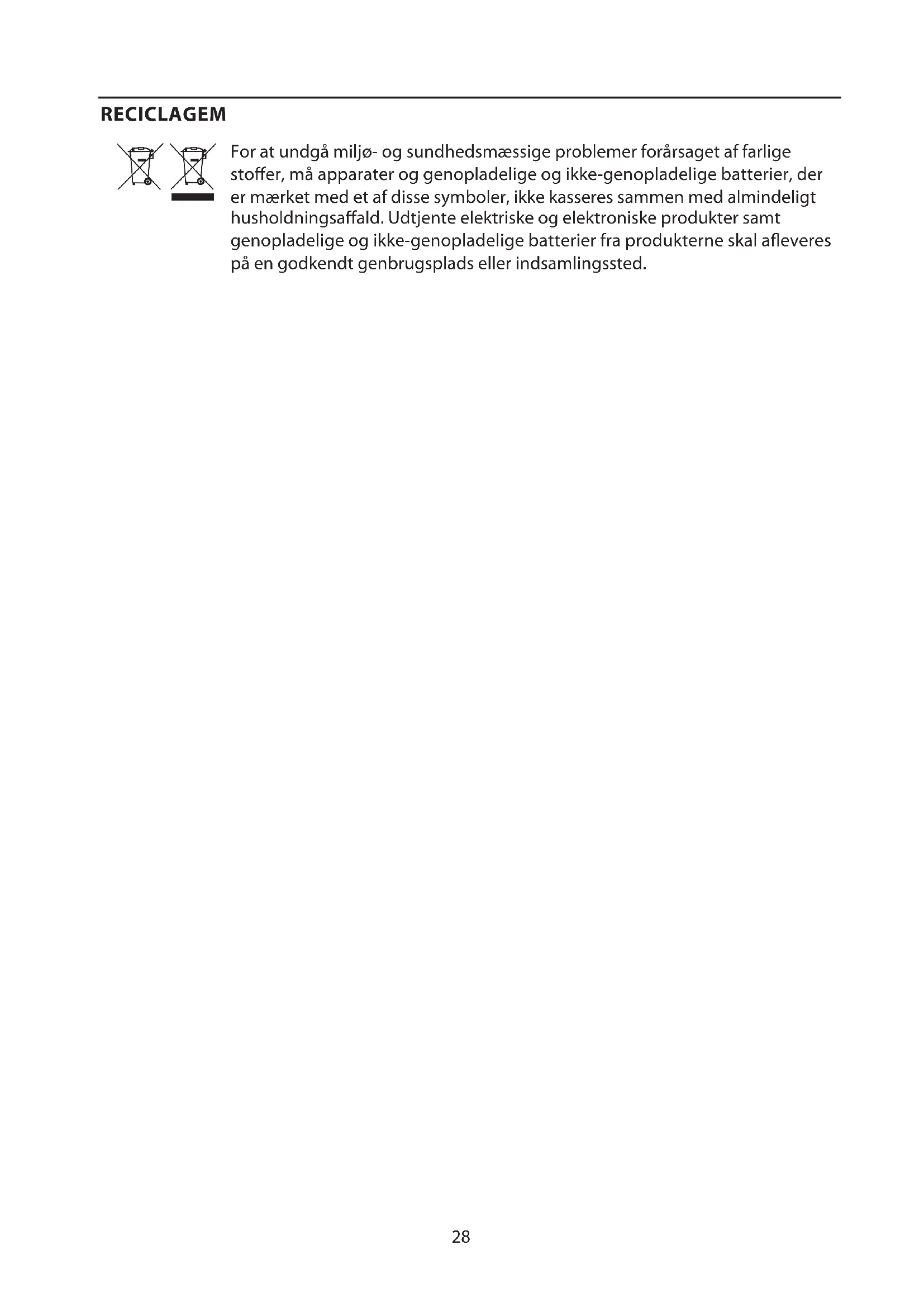 For at undgå miljø- og sundhedsmæssige problemer forårsaget af farlige stoer, må apparater og genopladelige og ikke-genopladelige batterier, der er mærket med et af disse symboler, ikke kasseres sammen med almindeligt husholdningsaald. Udtjente elektriske og elektroniske produkter samt genopladelige og ikke-genopladelige batterier fra produkterne skal aeveres på en godkendt genbrugsplads eller indsamlingssted.