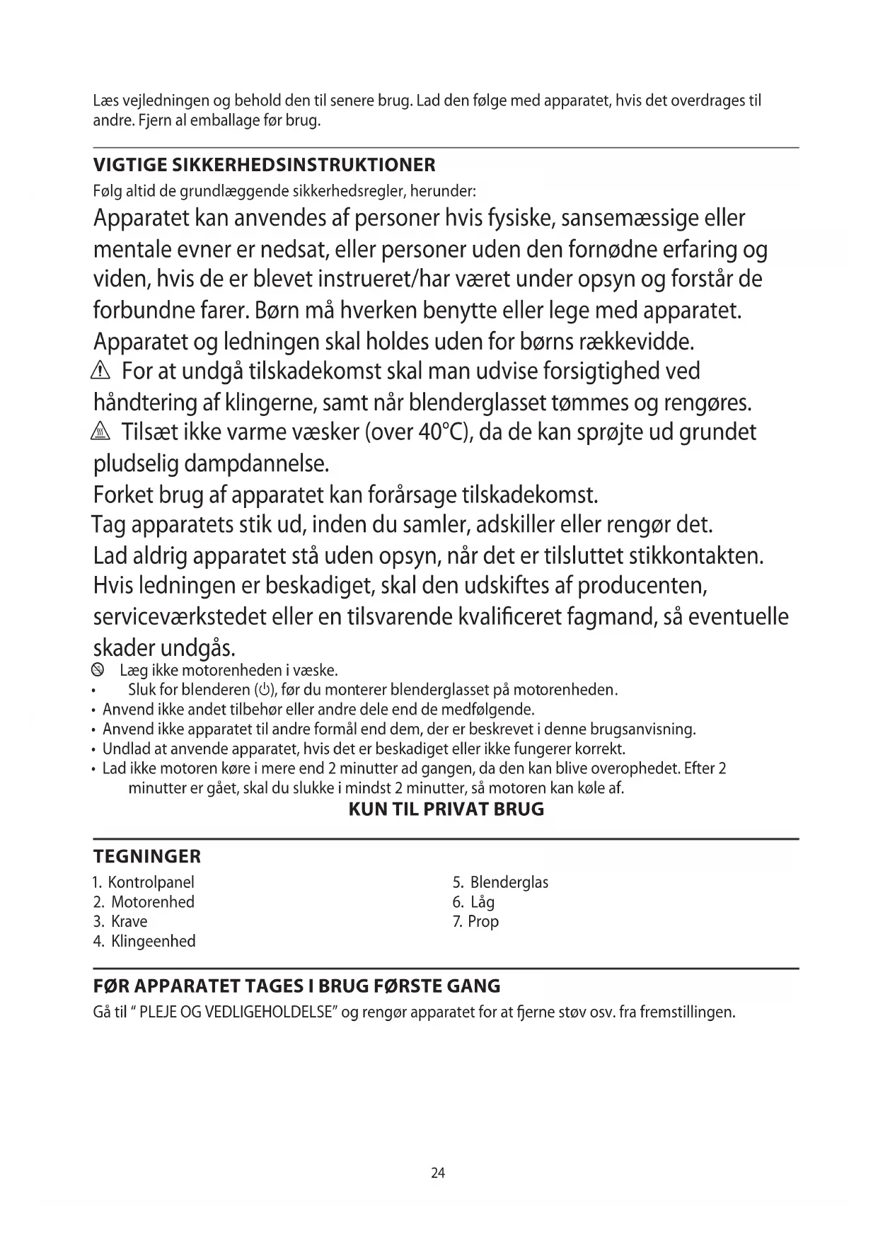 AE24 Læs vejledningen og behold den til senere brug. Lad den følge med apparatet, hvis det overdrages til andre. Fjern al emballage før brug. VIGTIGE SIKKERHEDSINSTRUKTIONER Følg altid de grundlæggende sikkerhedsregler, herunder: Apparatet kan anvendes af personer hvis fysiske, sansemæssige eller mentale evner er nedsat, eller personer uden den fornødne erfaring og viden, hvis de er blevet instrueret/har været under opsyn og forstår de forbundne farer. Børn må hverken benytte eller lege med apparatet. Apparatet og ledningen skal holdes uden for børns rækkevidde. c For at undgå tilskadekomst skal man udvise forsigtighed ved håndtering af klingerne, samt når blenderglasset tømmes og rengøres. h Tilsæt ikke varme væsker (over 40°C), da de kan sprøjte ud grundet pludselig dampdannelse. Forket brug af apparatet kan forårsage tilskadekomst. Tag apparatets stik ud, inden du samler, adskiller eller rengør det. Lad aldrig apparatet stå uden opsyn, når det er tilsluttet stikkontakten. Hvis ledningen er beskadiget, skal den udskiftes af producenten, serviceværkstedet eller en tilsvarende kvaliceret fagmand, så eventuelle skader undgås. l Læg ikke motorenheden i væske.