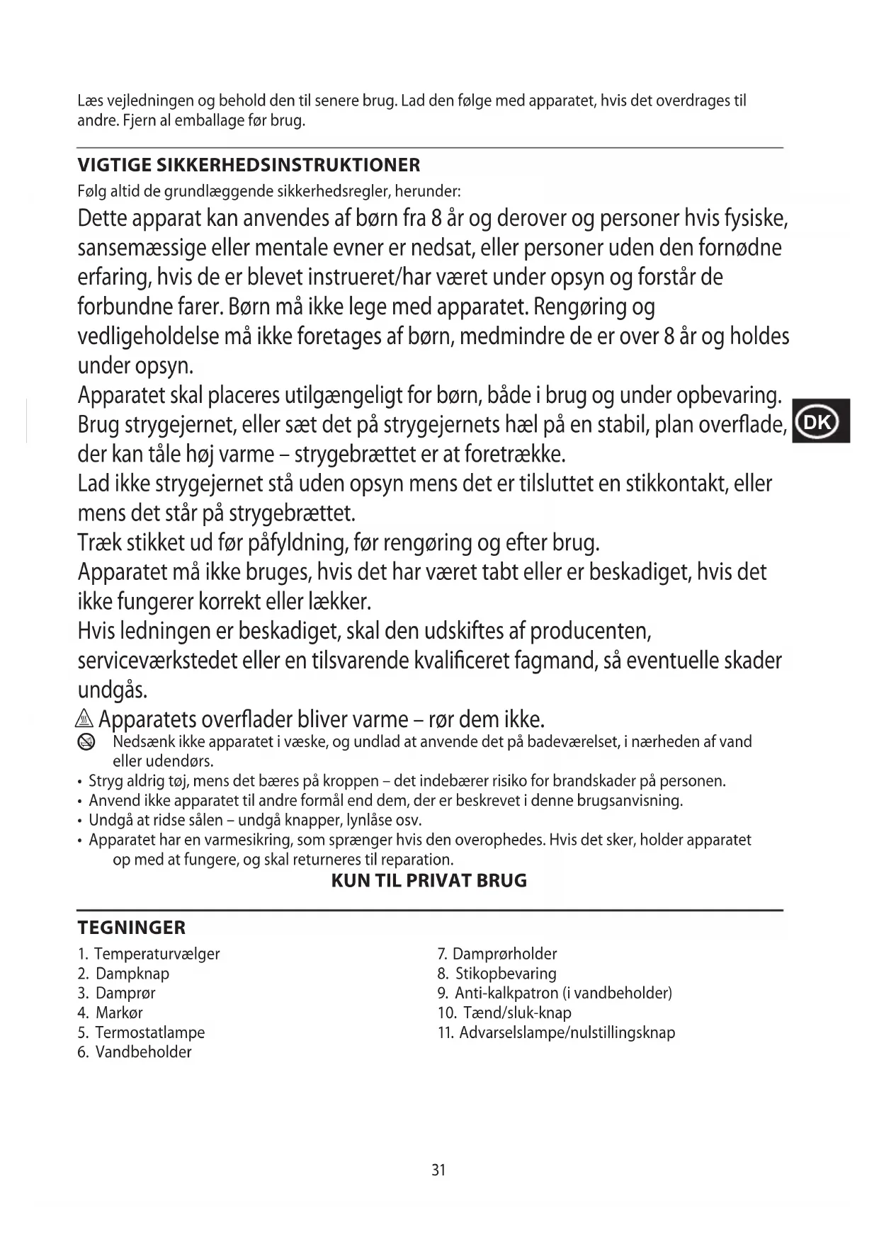 Læs vejledningen og behold den til senere brug. Lad den følge med apparatet, hvis det overdrages til andre. Fjern al emballage før brug. VIGTIGE SIKKERHEDSINSTRUKTIONER Følg altid de grundlæggende sikkerhedsregler, herunder: Dette apparat kan anvendes af børn fra 8 år og derover og personer hvis fysiske, sansemæssige eller mentale evner er nedsat, eller personer uden den fornødne erfaring, hvis de er blevet instrueret/har været under opsyn og forstår de forbundne farer. Børn må ikke lege med apparatet. Rengøring og vedligeholdelse må ikke foretages af børn, medmindre de er over 8 år og holdes under opsyn. Apparatet skal placeres utilgængeligt for børn, både i brug og under opbevaring. Brug strygejernet, eller sæt det på strygejernets hæl på en stabil, plan overade, der kan tåle høj varme – strygebrættet er at foretrække. Lad ikke strygejernet stå uden opsyn mens det er tilsluttet en stikkontakt, eller mens det står på strygebrættet. Træk stikket ud før påfyldning, før rengøring og efter brug. Apparatet må ikke bruges, hvis det har været tabt eller er beskadiget, hvis det ikke fungerer korrekt eller lækker. Hvis ledningen er beskadiget, skal den udskiftes af producenten, serviceværkstedet eller en tilsvarende kvaliceret fagmand, så eventuelle skader undgås. h Apparatets overader bliver varme – rør dem ikke.