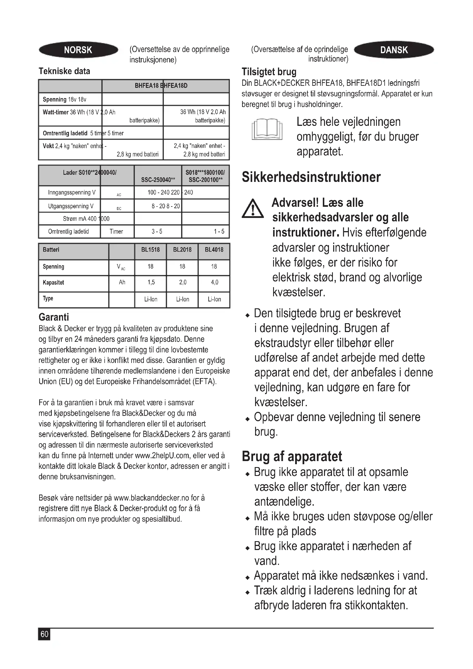 18 18 18KapacitetAh 1,5 2,0 4,0 Type Li-Ion Li-Ion Li-Ion66 (Oversættelse af de oprindelige instruktioner)DANSK(Alkuperäisten ohjeiden käännös)SUOMI Garanti Black & Decker er overbevist om den gode kvalitet af sine produkter og giver forbrugerne en garanti på 24 måneder fra købsdatoen. Garantien er et tillæg til forbrugerens lovmæssige rettigheder og påvirker ikke disse. Garantien er gyldig inden for medlemsstaterne af Den Europæiske Unionog Det Europæiske Frihandelsområde.Når du gør krav på garantien, skal kravet være i overensstemmelse med Black&Decker vilkår og betingelser, og du skal indsende dokumentation for købet til sælgeren eller til en autoriseret reparatør. Vilkår og betingelser for Black & Decker 2 års garanti og placeringen af dit nærmeste autoriserede serviceværksted kan fås på internettet på www.2helpU.com, eller ved at kontakte dit lokale Black & Decker kontor på den adresse, der er angivet i denne vejledning.Besøg venligst vores websted www.blackanddecker.co.uk for at registrere dit nye Black & Decker produkt og modtage opdateringer om nye produkter og specielle tilbud.(Alkuperäisten ohjeiden käännös)SUOMI Käyttötarkoitus Akkutoimiset BLACK+DECKER BHFEA18, BHFEA18D1 -pölynimurit on tarkoitettu imuroimiseen. Laite on tarkoitettu ainoastaan kotitalouskäyttöön. Lue nämä ohjeet huolellis- esti ennen laitteen käyttöä. Turvallisuusohjeet