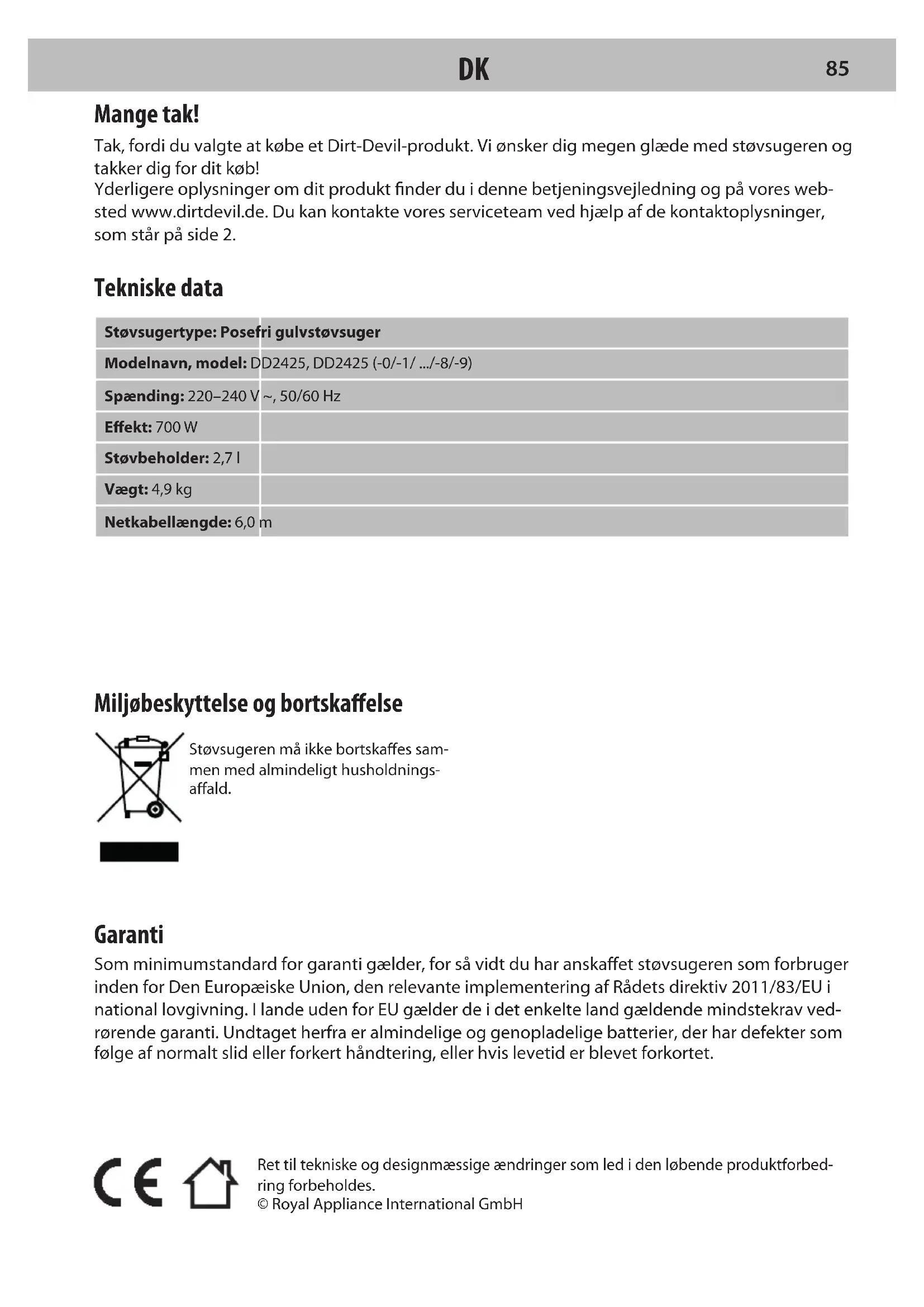 84Miljøbeskyttelse og bortskaelse Støvsugeren må ikke bortskaes sam- men med almindeligt husholdnings- aald. Garanti Som minimumstandard for garanti gælder, for så vidt du har anskaet støvsugeren som forbruger inden for Den Europæiske Union, den relevante implementering af Rådets direktiv 2011/83/EU i national lovgivning. I lande uden for EU gælder de i det enkelte land gældende mindstekrav ved- rørende garanti. Undtaget herfra er almindelige og genopladelige batterier, der har defekter som følge af normalt slid eller forkert håndtering, eller hvis levetid er blevet forkortet. Ret til tekniske og designmæssige ændringer som led i den løbende produktforbed- ring forbeholdes. © Royal Appliance International GmbH Mange tak! Tak, fordi du valgte at købe et Dirt-Devil-produkt. Vi ønsker dig megen glæde med støvsugeren og takker dig for dit køb! Yderligere oplysninger om dit produkt nder du i denne betjeningsvejledning og på vores web- sted www.dirtdevil.de. Du kan kontakte vores serviceteam ved hjælp af de kontaktoplysninger, som står på side 2. Tekniske data Støvsugertype: Posefri gulvstøvsuger Modelnavn, model: DD2425, DD2425 (-0/-1/ .../-8/-9) Spænding: 220–240 V ~, 50/60 Hz Eekt: 700 W Støvbeholder: 2,7 l Vægt: 4,9 kg Netkabellængde: 6,0 m