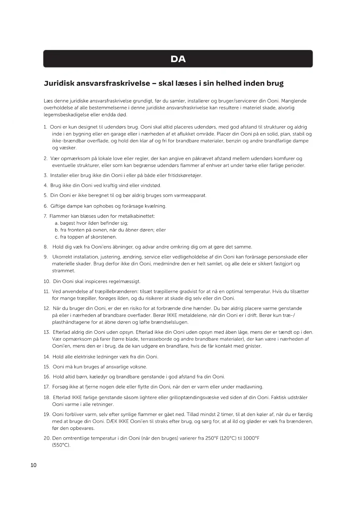 1. Ooni er kun designet til udendørs brug. Ooni skal altid placeres udendørs, med god afstand til strukturer og aldrig