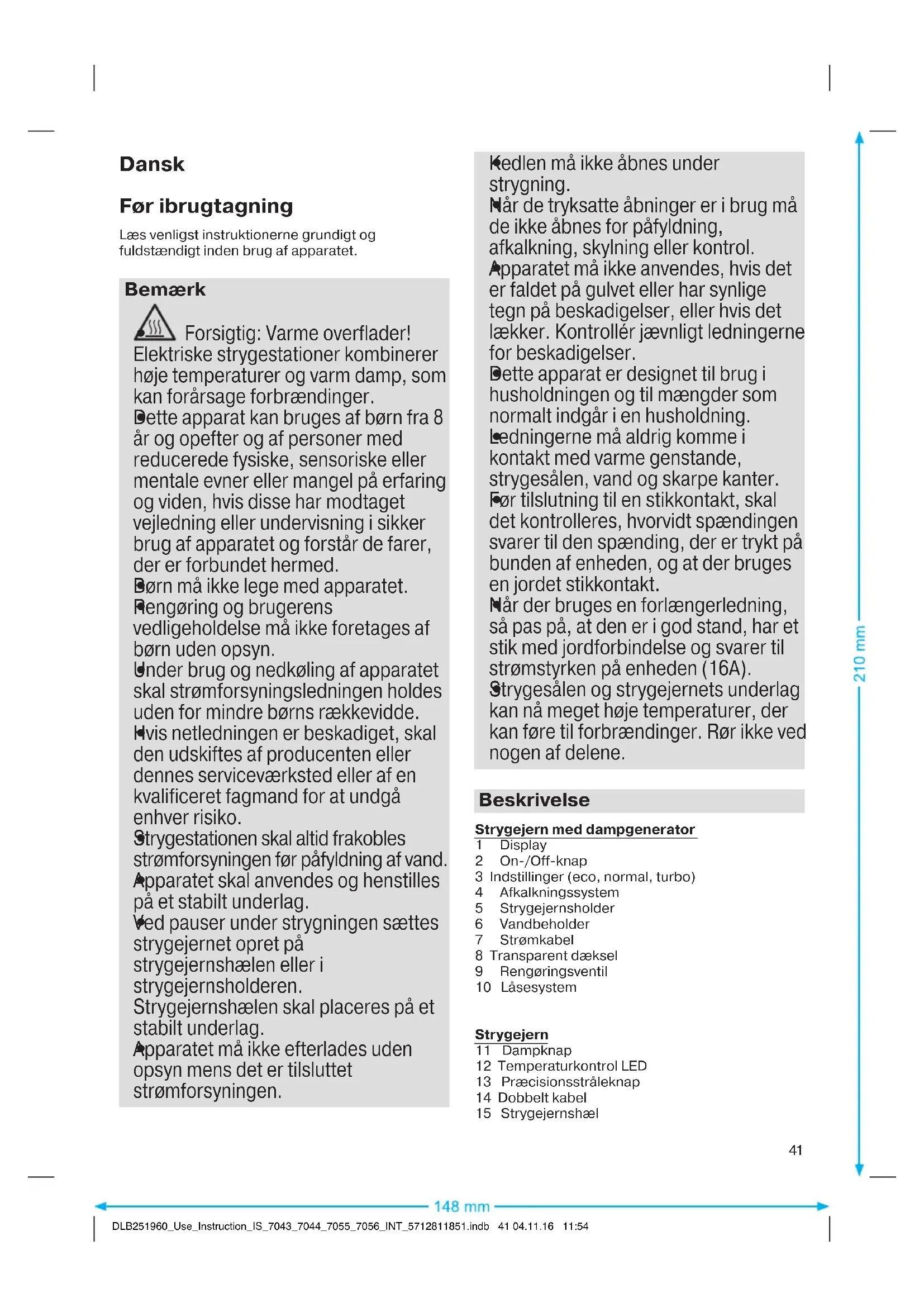 DLB251960_Use_Instruction_IS_7043_7044_7055_7056_INT_5712811851.indb 40 04.11.16 11:54Dansk Før ibrugtagning Læs venligst instruktionerne grundigt og fuldstændigt inden brug af apparatet. Bemærk