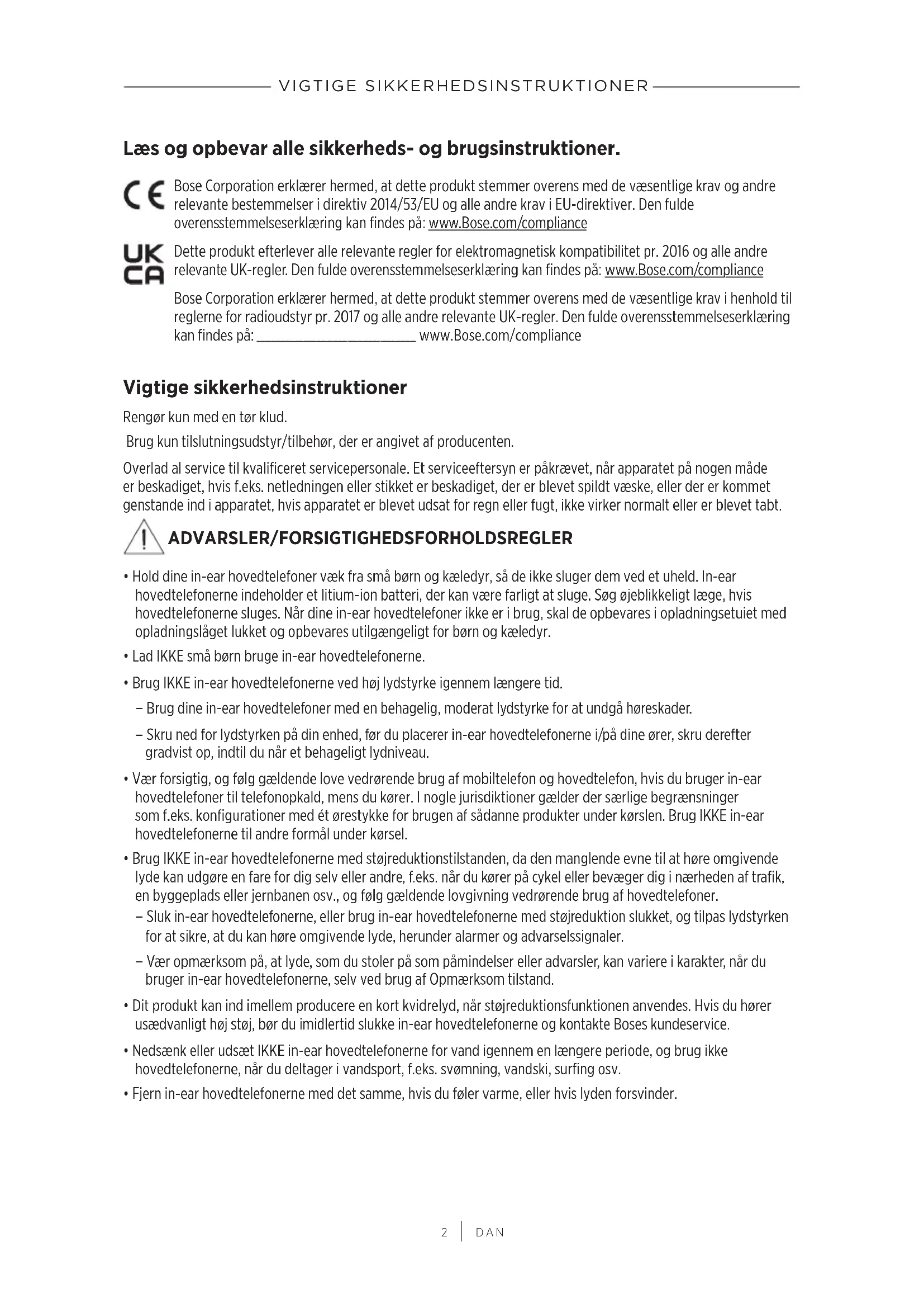 Bose Corporation erklær hermed, at dette produkt stemmer overens med de væsentlige krav i henhold til reglere for radioudstyr pr. 2017 og alle andre relevante UK-regler. Den fulde overensstemmelseserklaering kan vindes på: www.Bose.com/compliance