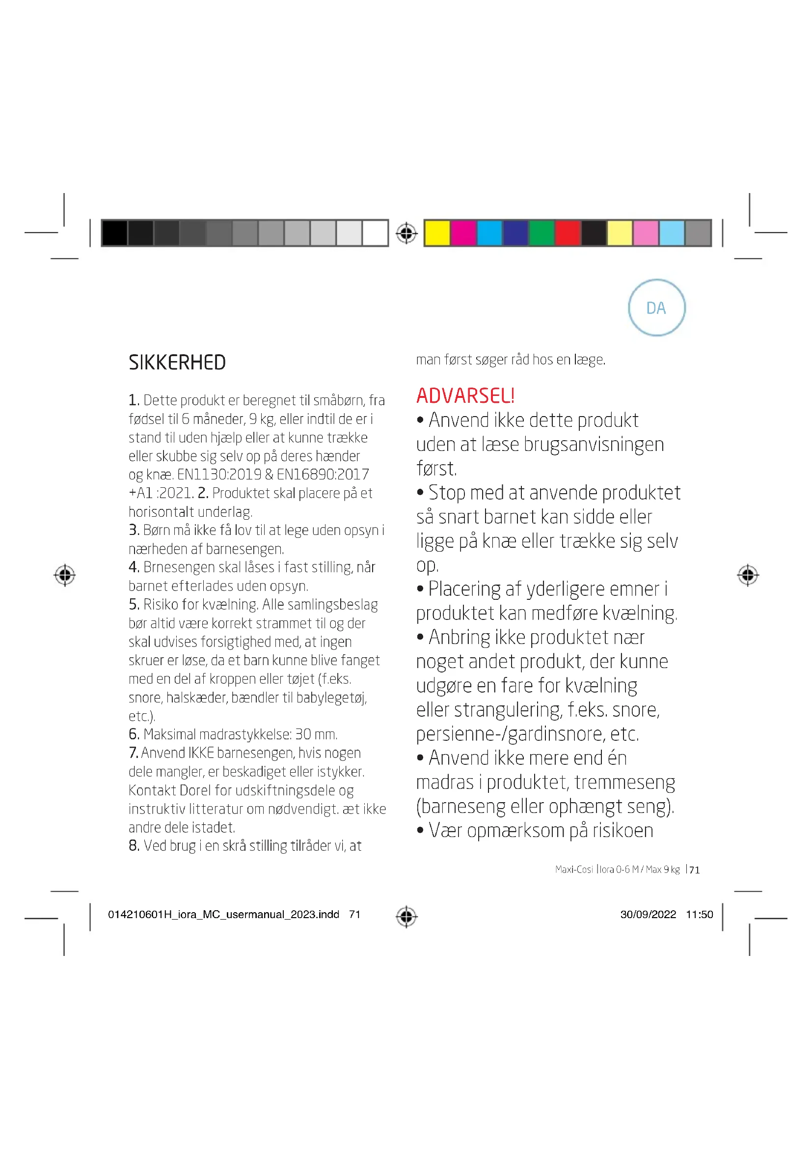 - Rådfør med instruktionsmærkaten vedrørende vask af stoet. Miljø Af hensyn til miljøet bedes du aflevere dette produkt i egnede aaldsdeponeringsanlæg i overensstemmelse med lokal lovgivning. Spørgsmål Kontakt din lokale forhandler eller besøg vores hjemmeside. Sørg for at have følgende oplysninger ved hånden: - Serienummer - Dit barns alder (højde) og vægt. Garanti Vores 24 måneders garanti afspejler vores tillid til den enestående kvalitet af vores design, konstruktion, produktion og produktets ydeevne. Vi bekræfter, at dette produkt er fremstillet i overensstemmelse med de nuværende europæiske sikkerhedskrav og kvalitetskrav, der gælder for dette produkt, og at dette produkt er fri for fejl i materialer og udførelse på tidspunktet for købet. Ifølge de heri nævnte betingelser kan denne garanti påberåbes af forbrugere i landene, hvor dette produkt er blevet solgt af et datterselskab i Dorel-
