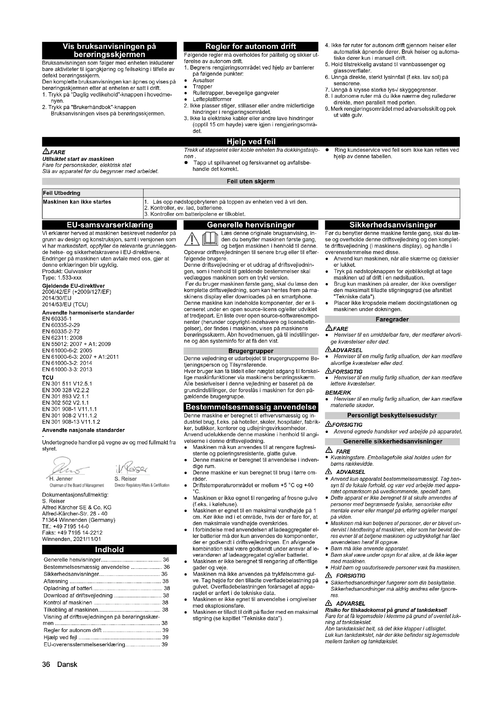 Undertegnede handler på vegne av og med fullmakt fra styret. Dokumentasjonsfullmektig: S. Reiser Alfred Kärcher SE & Co. KG Alfred-Kärcher-Str. 28 - 40 71364 Winnenden (Germany) Tlf.: +49 7195 14-0 Faks: +49 7195 14-2212 Winnenden, 2021/11/01 Indhold Generelle henvisninger Læs denne originale brugsanvising, in- den du benytter maskinen første gang, og betjen maskinen i henhold til denne. Opbevar driftsvejledningen til senere brug eller til efter- følgende brugere. Denne driftsvejledning er et uddrag af driftsvejlednin- gen, som i henhold til gældende bestemmelser skal vedlægges maskinen som en trykt version. Før du bruger maskinen første gang, skal du læse den komplette driftsvejledning, som kan hentes frem på ma- skinens display eller downloades på en smartphone. Denne maskine kan indeholde komponenter, der er li- censeret under en open source-licens og/eller udviklet af tredjepart. En liste over open source-softwarekompo- nenter (herunder copyright-indehavere og licensbetin- gelser), der findes i maskinen, vises på maskinens berøringsskærm. Åbn hovedmenuen, gå til indstillinger- ne og åbn systeminfo for at få den vist. Brugergrupper Denne vejledning er udarbejdet til brugergrupperne Be- tjeningsperson og Tilsynsførende. Hver bruger kan få tildelt eller nægtet adgang til forskel- lige maskinfunktioner via maskinens berøringsskærm. Alle beskrivelser i denne vejledning er baseret på de grundindstillinger, der foreslås i maskinen for den på- gældende brugergruppe. Bestemmelsesmæssig anvendelse Denne maskine er beregnet til erhvervsmæssig og in- dustriel brug, f.eks. på hoteller, skoler, hospitaler, fabrik- ker, butikker, kontorer og udlejningsvirksomheder. Anvend udelukkende denne maskine i henhold til angi- velserne i denne driftsvejledning. ● Maskinen må kun anvendes til at rengøre fugtresi- stente og poleringsresistente, glatte gulve. ● Denne maskine er beregnet til anvendelse i indven- dige rum. ● Denne maskine er kun beregnet til brug i tørre om- råder. ● Driftstemperaturområdet er mellem +5 °C og +40 °C. ● Maskinen er ikke egnet til rengøring af frosne gulve (f.eks. i kølehuse). ● Maskinen er egnet til en maksimal vandhøjde på 1 cm. Kør ikke ind i et område, hvis der er fare for, at den maksimale vandhøjde overskrides. ● I forbindelse med anvendelsen af ladeaggregater el- ler batterier må der kun anvendes de komponenter, der er godkendt i driftsvejledningen. En afvigende kombination skal være godkendt under ansvar af le- verandøren af ladeaggregatet og/eller batteriet. ● Maskinen er ikke beregnet til rengøring af offentlige gader og veje. ● Maskinen må ikke anvendes på trykfølsomme gul- ve. Tag højde for den tilladte overfladebelastning på gulvet. Overfladebelastningen forårsaget af appa- raqtet er anført i de tekniske data. ● Maskinen er ikke egnet til anvendelse i omgivelser med eksplosionsfare. ● Maskinen er tilladt til drift på flader med en maksimal stigning (se kapitlet “Tekniske data”). Sikkerhedsanvisninger Før du benytter denne maskine første gang, skal du læ- se og overholde denne driftsvejledning og den komplet- te driftsvejledning (i maskinens display), og handle i overensstemmelse med disse. ● Anvend kun maskinen, når alle skærme og dæksler er lukket. ● Tryk på nødstopknappen for øjeblikkeligt at tage maskinen ud af drift i en nødsituation. ● Brug kun maskinen på arealer, der ikke overstiger den maksimalt tilladte stigningsgrad (se afsnittet "Tekniske data"). ● Placer ikke kropsdele mellem dockingstationen og maskinen under dokningen. Faregrader FARE ● Henviser til en umiddelbar fare, der medfører alvorli- ge kvæstelser eller død. 몇 ADVARSEL ● Henviser til en mulig farlig situation, der kan medføre alvorlige kvæstelser eller død. 몇 FORSIGTIG ● Henviser til en mulig farlig situation, der kan medføre lettere kvæstelser. BEMÆRK ● Henviser til en mulig farlig situation, der kan medføre materielle skader. Personligt beskyttelsesudstyr 몇 FORSIGTIG ● Anvend egnede handsker ved arbejde på apparatet. Generelle sikkerhedsanvisninger