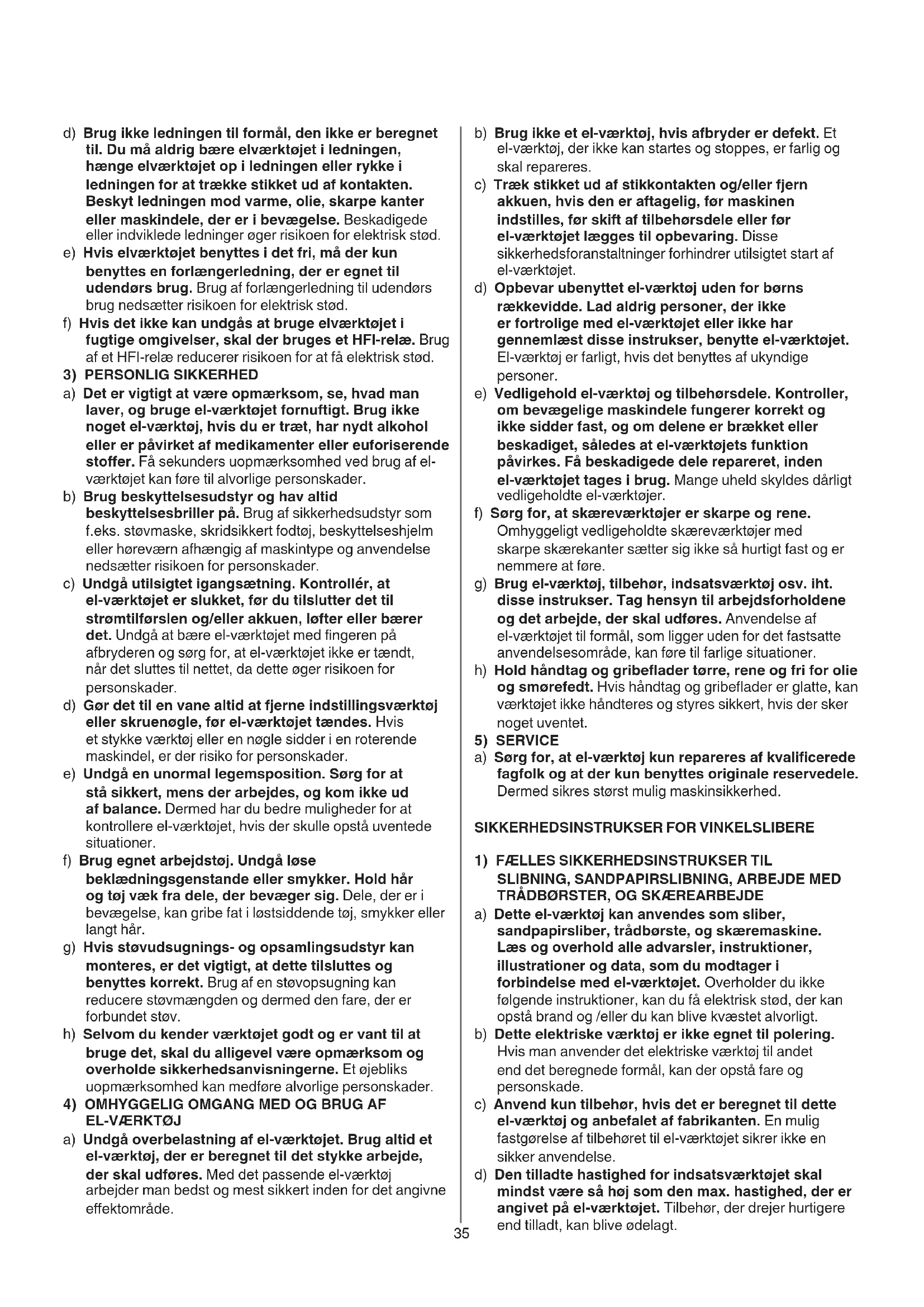 a) Dette el-værktøj kan anvendes som sliber, sandpapirsliber, trådbørste, og skæremaskine. Læs og overhold alle advarsler, instruktioner, illustrationer og data, som du modtager i forbindelse med el-værktøjet. Overholder du ikke følgende instruktioner, kan du få elektrisk stød, der kan opstå brand og /eller du kan blive kvæstet alvorligt. b) Dette elektriske værktøj er ikke egnet til polering. Hvis man anvender det elektriske værktøj til andet end det beregnede formål, kan der opstå fare og personskade. c) Anvend kun tilbehør, hvis det er beregnet til dette el-værktøj og anbefalet af fabrikanten. En mulig fastgørelse af tilbehøret til el-værktøjet sikrer ikke en sikker anvendelse. d) Den tilladte hastighed for indsatsværktøjet skal mindst være så høj som den max. hastighed, der er angivet på el-værktøjet. Tilbehør, der drejer hurtigere end tilladt, kan blive ødelagt. d) Brug ikke ledningen til formål, den ikke er beregnet til. Du må aldrig bære elværktøjet i ledningen, hænge elværktøjet op i ledningen eller rykke i ledningen for at trække stikket ud af kontakten. Beskyt ledningen mod varme, olie, skarpe kanter eller maskindele, der er i bevægelse. Beskadigede eller indviklede ledninger øger risikoen for elektrisk stød. e) Hvis elværktøjet benyttes i det fri, må der kun benyttes en forlængerledning, der er egnet til udendørs brug. Brug af forlængerledning til udendørs brug nedsætter risikoen for elektrisk stød. f) Hvis det ikke kan undgås at bruge elværktøjet i fugtige omgivelser, skal der bruges et HFI-relæ. Brug af et HFI-relæ reducerer risikoen for at få elektrisk stød.
