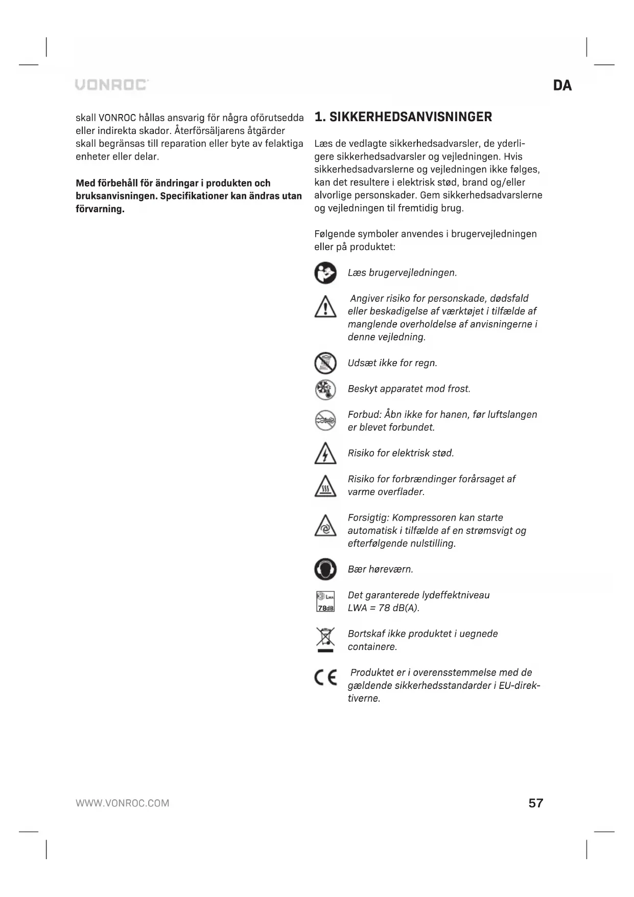 Det garanterede lydeffektniveau LWA = 78dB(A). Bortskaf ikke produktet i uegnede containere. Produktet er i overensstemmelse med de gældende sikkerhedsstandarder i EU-direk- tiverne.58