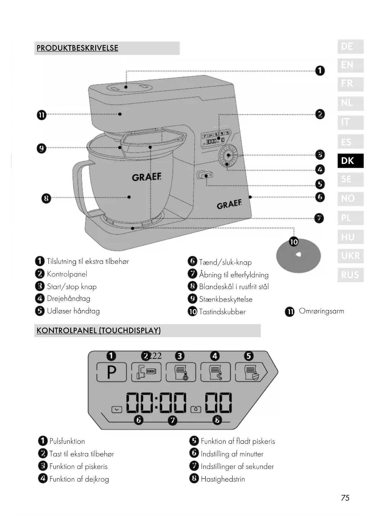 Du kan også købe ekstra tilbehør til denne køkkenmaskine. Gå til vores hjemmeside på www. graef.de for flere oplysninger. 5 ÅRS GARANTI Dette produkt leveres med en producentgaranti på 60 måneder for mangler, der kan spores tilbage til produktions- eller materialefejl, som begynder fra købsdatoen, samt en 60 måneders garanti på motoren. Dine juridiske garantikrav i henhold til § 437 forbliver uberørt. Garantien dækker ikke skader der er forårsaget af ukorrekt håndtering eller brug, samt mangler der kun påvirker funktionen eller maskinens værdi en smule. I sådanne tilfælde bortfalder garantien. Desuden er transportskader, for så vidt de ikke er vores ansvarsområde, udelukket fra garanti- kravet. Skader der skyldes en reparation der ikke er udført af os, eller af vores anbefalede serviceværksted, vil garantien være ugyldig. I tilfælde af berettigede reklamationer vil vi efter vores valg reparere den defekte maskine eller udskifte den med et mangelfrit produkt.85
