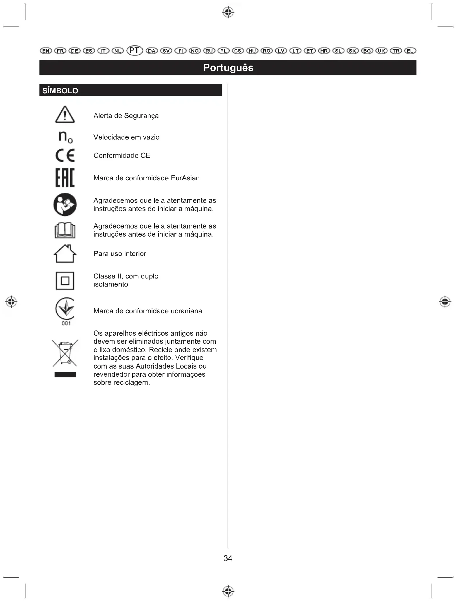 EN FR DE ES IT NL PT SV FI NO RU PL CS HU RO LV LT ET HR SL SK UKBG TR EL SYMBOL Sikkerheds Varsel Tomgangshastighed CE Overensstemmelse EurAsian overensstemmelsesmærke /VYHQOLJVWYHMOHGQLQJHQJUXQGLJW igennem før maskinen tages i brug. /VYHQOLJVWYHMOHGQLQJHQJUXQGLJW igennem før maskinen tages i brug. Indendørs anvendelse Klasse II, dobbeltisoleret Ukrainsk overensstemmelsesmærke Elektriske affalds produkter burde ikke afskaffes sammen med husholdnings affald. Venligst genbruge hvor faciliteter WLOODGHUGHWWH7MHNPHGGLQORFDO kommune eller forhandler for genbrugs råd.40 Svenska