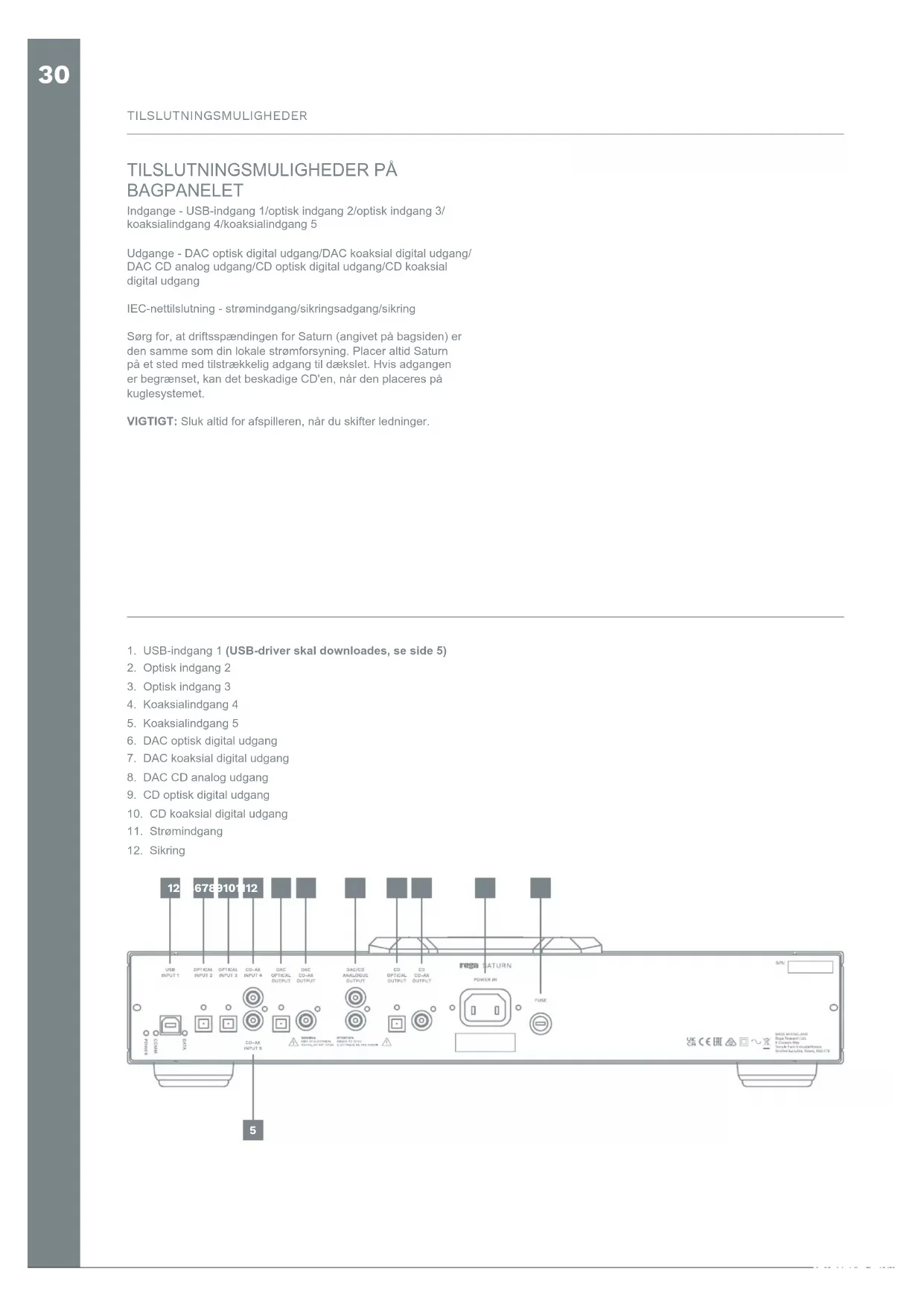 BAGPANELET Der ndes tre LED-indikatorer på bagpanelet. POWER - USB'en forsynes med strøm fra den tilsluttede computer. Denne indikator bliver ved med at lyse mens den er tilsluttet, også selvom Saturn er slukket. COMM - USB-indgangen er aktiv og kommunikerer med den tilsluttede computer. DATA - Denne indikator angiver, at data overføres via USB- indgangen. Den vil f.eks. lyse, når der afspilles et nummer ved hjælp af en medieafspiller, eller når en internetradiostation er aktiv. DAC-FUNKTIONER Det anbefales at slukke for alle andre systemlyde, der spilles via pc'en, på kontrolpanelet. I nogle systemer bliver DAC automatisk standard for din pc, når den er tilsluttet. Hvis forbindelsen afbrydes, bør den tidligere standard automatisk gendannes. Hvis det ikke sker, kan du manuelt nulstille på følgende måde: Windows: Kontrolpanel > Hardware og lyd > Administrer lydenheder > vælg ‘Saturn’ på listen. MacOS: Systemindstillinger > Lydudgang > Vælg ‘Saturn’.34 ANSLUTNING