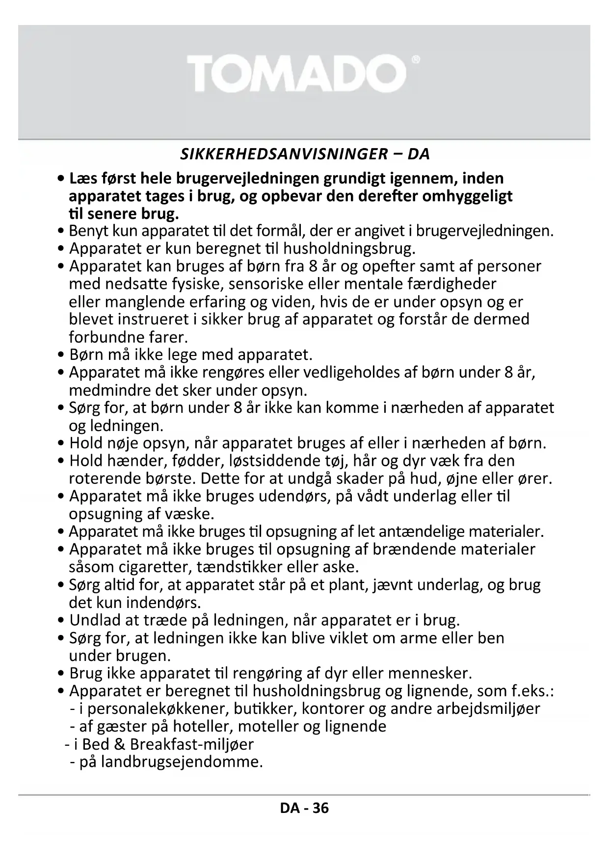 - Brugaflbehør,somikkeeranbefaletellersolgtafTomado, kanforårsagebrand,elektriskstødellerpersonskade.