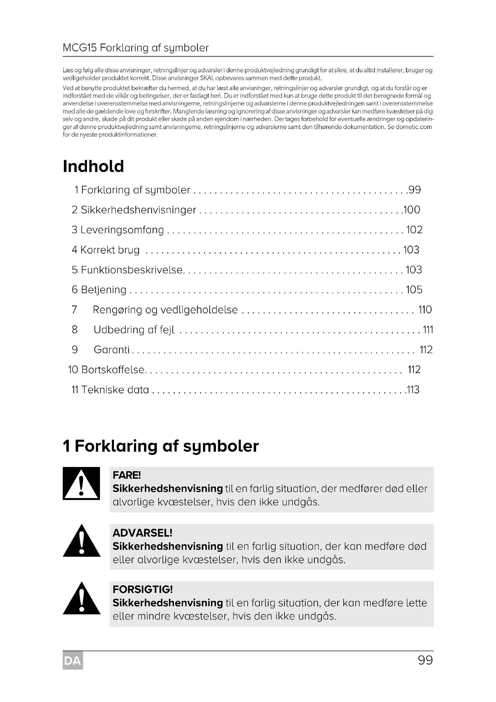 - Læs og følg alle disse anvisninger, retningslinjer og advarsler i denne produktvejledning grundigt for at sikre, at du altid installerer, bruger og vedligeholder produktet korrekt. Disse anvisninger SKAL opbevares sammen med dette produkt. Ved at benytte produktet bekræfter du hermed, at du har læst alle anvisninger, retningslinjer og advarsler grundigt, og at du forstår og er indforstået med de vilkår og betingelser, der er fastlagt heri. Du er indforstået med kun at bruge dette produkt til det beregnede formål og anvendelse i overensstemmelse med anvisningerne, retningslinjerne og advarslerne i denne produktvejledningen samt i overensstemmelse med alle de gældende love og forskrifter. Manglende læsning og ignorering af disse anvisninger og advarsler kan medføre kvæstelser på dig selv og andre, skade på dit produkt eller skade på anden ejendom i nærheden. Der tages forbehold for eventuelle ændringer og opdaterin- ger af denne produktvejledning samt anvisningerne, retningslinjerne og advarslerne samt den tilhørende dokumentation. Se dometic.com for de nyeste produktinformationer. Indhold 1 Forklaring af symboler p. 99