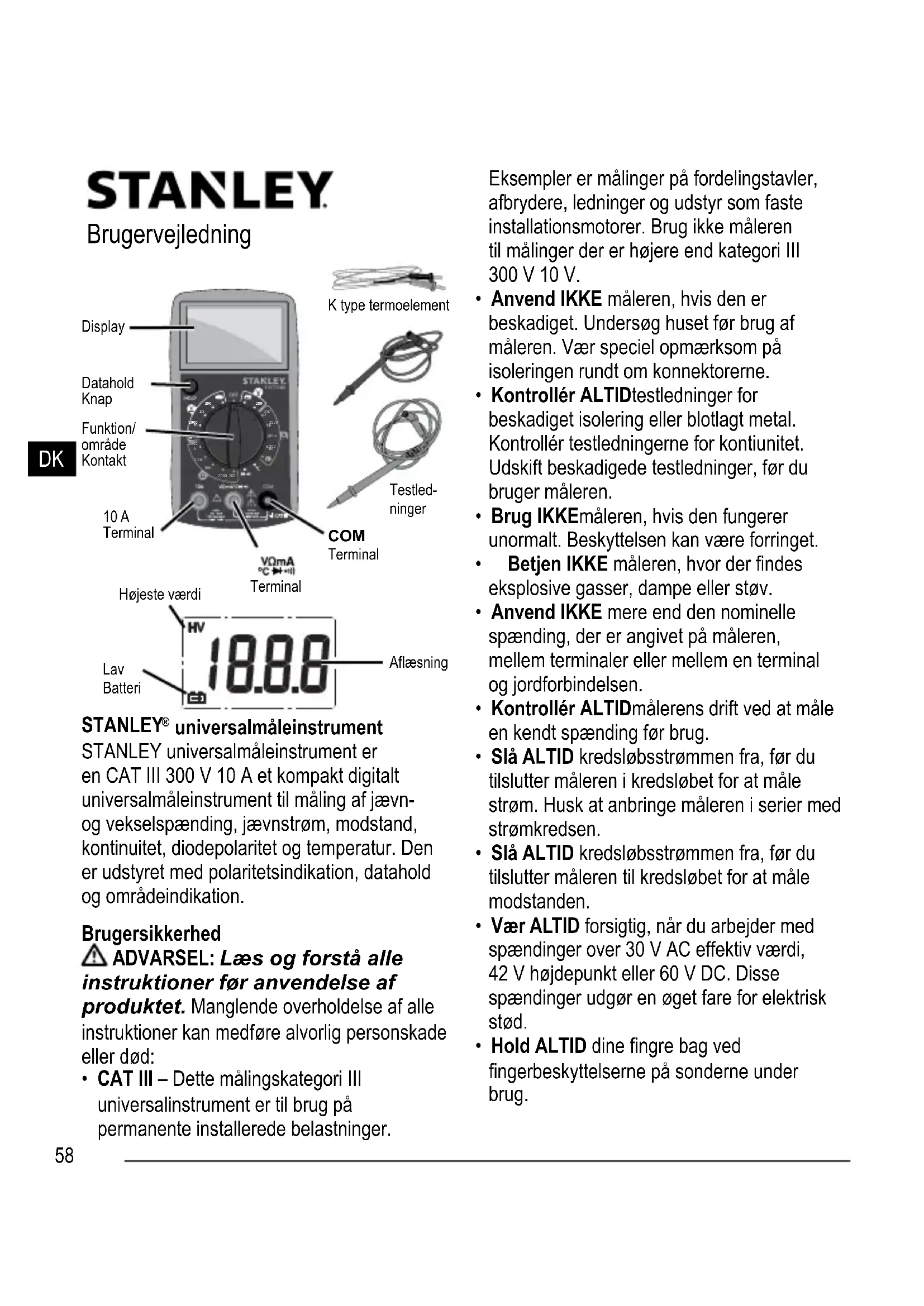 STANLEY universalmaleinstrument er en CAT III 300 V 10 A et kompakt digitalt universalmaleinstrument til maling af javnog vekselspænding, javnstrøm, modstand, kontinuitet, diodepolaritet og temperatur. Den er udstyret med polaritetsindikation, datahold og områdeindikation.