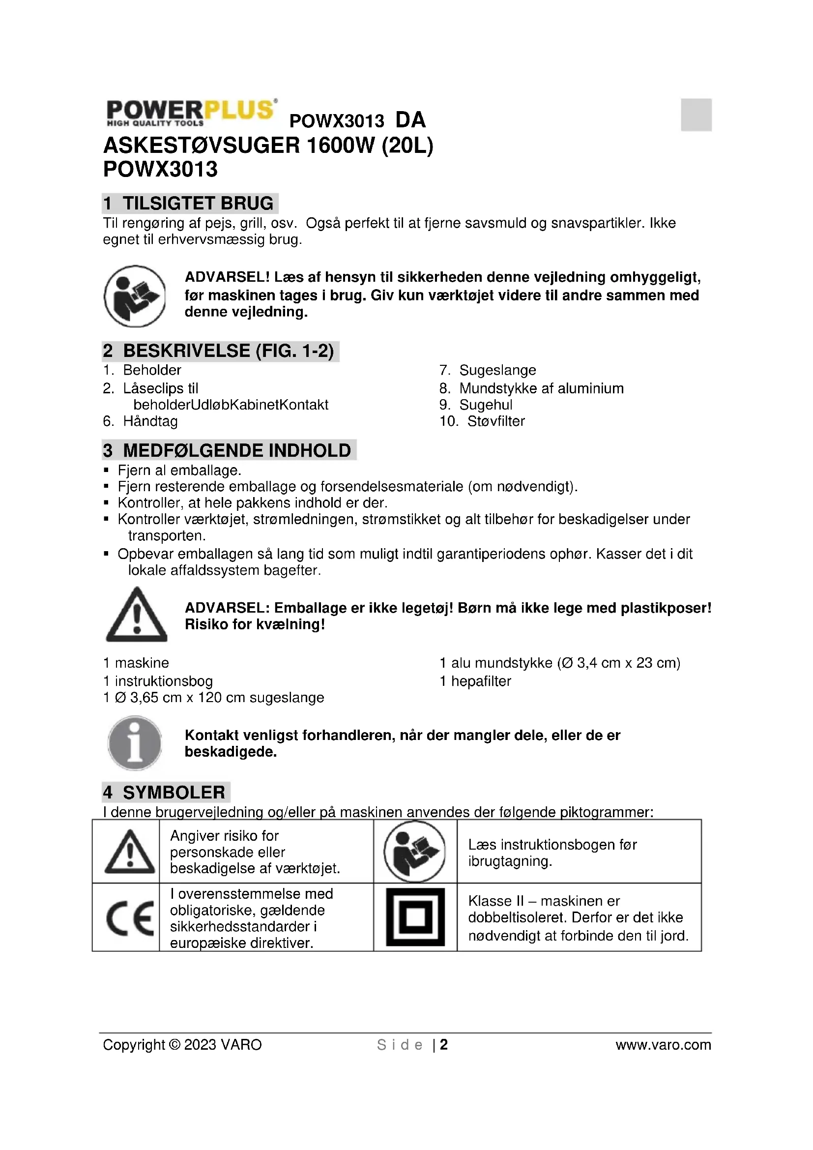 Copyright © 2023 VARO S i d e | 2 www.varo.com ASKESTØVSUGER 1600W (20L) POWX3013 1 TILSIGTET BRUG Til rengøring af pejs, grill, osv. Også perfekt til at fjerne savsmuld og snavspartikler. Ikke egnet til erhvervsmæssig brug. ADVARSEL! Læs af hensyn til sikkerheden denne vejledning omhyggeligt, før maskinen tages i brug. Giv kun værktøjet videre til andre sammen med denne vejledning. 2 BESKRIVELSE (FIG. 1-2)