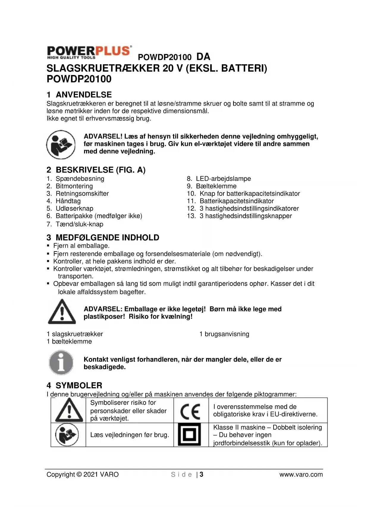 Copyright © 2021 VARO S i d e | 3 www.varo.com SLAGSKRUETRÆKKER 20 V (EKSL. BATTERI) POWDP20100 1 ANVENDELSE Slagskruetrækkeren er beregnet til at løsne/stramme skruer og bolte samt til at stramme og løsne møtrikker inden for de respektive dimensionsmål. Ikke egnet til erhvervsmæssig brug. ADVARSEL! Læs af hensyn til sikkerheden denne vejledning omhyggeligt, før maskinen tages i brug. Giv kun el-værktøjet videre til andre sammen med denne vejledning. 2 BESKRIVELSE (FIG. A)