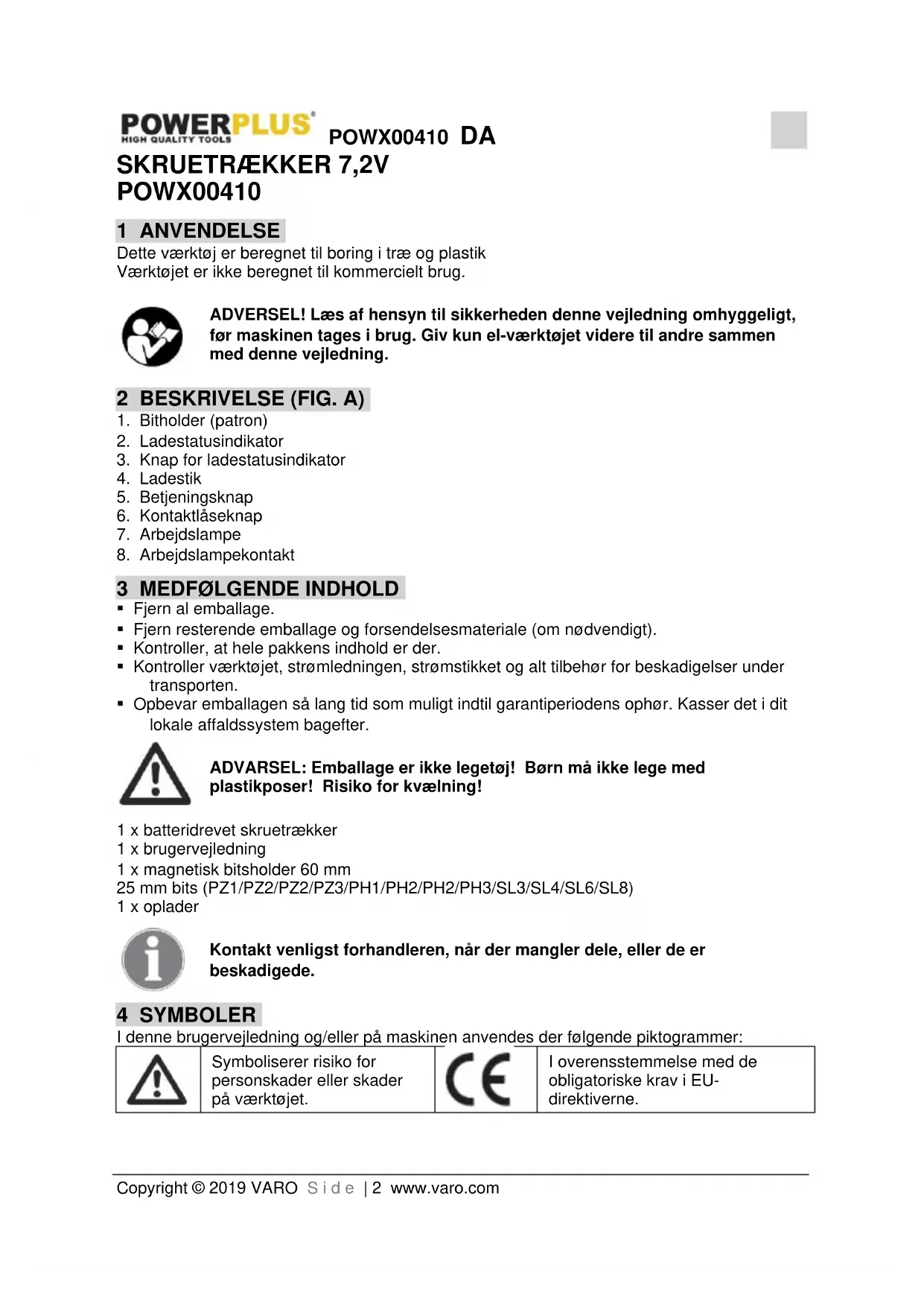 - Opbevar emballagen så lang tid som muligt indtil garantiperiodens ophør. Kasser det i dit lokale affaldssystem bagefter. ADVARSEL: Emballage er ikke legetøj! Børn må ikke lege med plastikposer! Risiko for kvælning! 1 x batteridrevet skruetrækker 1 x brugervejledning 1 x magnetisk bitsholder 60 mm 25 mm bits (PZ1/PZ2/PZ2/PZ3/PH1/PH2/PH2/PH3/SL3/SL4/SL6/SL8) 1 x oplader Kontakt venligst forhandleren, når der mangler dele, eller de er beskadigede. 4 SYMBOLER I denne brugervejledning og/eller på maskinen anvendes der følgende piktogrammer: