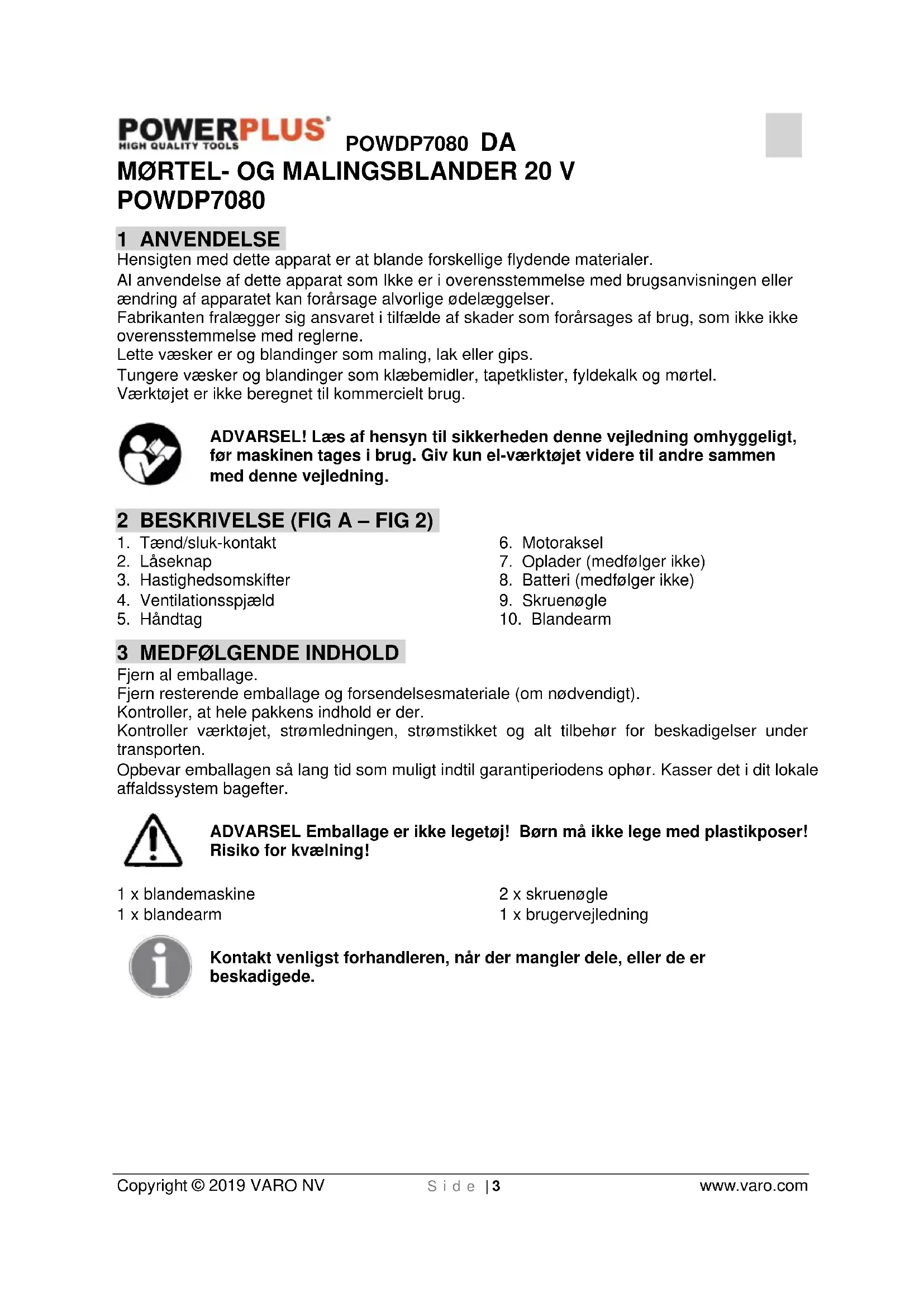 Friløbshastighed: 0-650min-1 Blanderdiamete 100 mm 11 STØJ Støjemissionsværdier er målt i overensstemmelse med gældende standarder. (K=3) Lydtryksniveau LpA 78 dB(A) Lydeffektniveau LwA 89 dB(A) BEMÆRK: brug høreværn når lydtrykket er over 85 dB(A). aw (Vibrationsniveau): 4,57 m/s² K = 1,5 m/s² 12 STØJSERVICEAFDELING Beskadigede afbrydere skal skiftes ud af vores kundeserviceværksted. Hvis tilslutningsledningen (eller netstikket) beskadiges, skal de skiftes ud med en særlig tilslutningsledning, som fås hos vores kundeservice (serviceafdeling). Udskiftningen afPOWDP7080 DA Copyright © 2019 VARO NV S i d e | 10 www.varo.com tilslutningsledningen må kun udføres af vores kundeservice (serviceafdeling - se sidste side) eller en kvalificeret person (el-installatør). 13 OPBEVARING Rengør hele maskinen og dens ekstraudstyr grundigt. Opbevar maskinen uden for børns rækkevidde, i en stabil og sikker position, på et køligt og tørt sted, undgå for høje og for lave temperaturer. Maskinen må ikke udsættes for direkte sollys. Opbevar den om muligt i mørke. Maskinen må ikke opbevares i plastikposer, da dette vil opbygge fugtighed. 14 GARANTI Produktet dækkes af garanti i en periode på 36 måneder fra den første købers købsdato. Garantien dækker alle materiale- eller produktionsfejl. Den omfatter ikke: batterier, opladere, dele, der udsættes for normal slitage, såsom lejer, børster, ledninger, stik eller tilbehør såsom bor, borebits, savklinger, osv., beskadigelse eller defekter som følge af misbrug, ulykke eller ændring eller transportomkostninger. Beskadigelse og/eller defekter som følge af misbrug er heller ikke omfattet af nærværende garanti. Vi fraskriver os også alt ansvar for enhver personskade som følge af forkert brug af værktøjet. Reparationer må kun udføres af et autoriseret kundeservicecenter til Powerplus-værktøjer. Du kan altid få mere information på tlf. 00 32 3 292 92 90. Alle transportomkostninger skal altid afholdes af kunden, medmindre andet er aftalt skriftligt. Ligeledes kan der ikke forlanges erstatning under nærværende garanti, hvis skaden på apparatet er opstået som følge af uagtsom vedligeholdelse eller overbelastning. Garantien dækker ikke skader der opstår som følge af gennemtrængt væske, overdreven støveksponering, bevidst beskadigelse (forsætligt eller ved grov uagtsomhed), upassende anvendelse (brug til formål som apparatet ikke er egnet til), ukompetent brug (såsom ikke at respektere instrukserne i denne vejledning), inkompetent montering, lynnedslag, forkert netspænding. Denne liste er ikke fuldstændig. Accept af krav under garantien kan ikke føre til forlængelse af garantiperioden eller påbegyndelsen af en ny garantiperiode, hvis apparatet udskiftes. Apparater eller dele, som udskiftes under garantien, bliver Varo NV's ejendom. Vi forbeholder os retten til at afvise alle krav, hvis købet ikke kan bekræftes, eller hvis det er tydeligt, at produktet ikke har været behørigt vedligeholdt. (rene udluftningsåbninger, regelmæssig service af kulbørster,…) Købskvitteringen skal opbevares som bevis på købsdatoen. Det samlede værktøj skal returneres til forhandleren i rimelig ren stand, i den originale blæseformede æske (hvis relevant for enheden) sammen med købsdokumentation. 15 MILJØ Hvis maskinen skal skiftes ud efter lang tids brug, må den ikke bortskaffes som husholdningsaffald, men skal bortskaffes på en miljømæssigt forsvarlig måde. Affald produceret af de elektriske maskiner må ikke behandles som normalt husaffald. Sørg for at genbruge det, hvor der findes egnede anlæg til det. Kontakt den lokale instans eller forhandleren for at få rådgivning om indsamling og bortskaffelse.POWDP7080 DA Copyright © 2019 VARO NV S i d e | 11 www.varo.com 16 KONFORMITETSERKLÆRING VARO N.V. – Joseph Van Instraat 9 – BE2500 Lier – Belgien, erklærer hermed, at Apparatbeskrivelse : Mørtel- og malingsblander Varemærke : POWERplus Varenummer : POWDP7080 er i overensstemmelse med de væsentlige krav og andre relevante bestemmelser i gældende europæiske direktiver, der er baseret på anvendelse af europæiske harmoniserede standarder. Enhver uautoriseret modifikation af apparatet ugyldiggør denne erklæring. EU-direktiver (herunder eventuelle tillæg frem til datoen for undertegnelsen): 2011/65/EU 2006/42/EC 2014/30/EU Harmoniserede europæiske standarder (herunder eventuelle tillæg frem til datoen for undertegnelsen): EN62841-1 : 2015 EN62841-2-10 : 2017 EN55014-1 : 2017 EN55014-2 : 2015 Indehaver af den tekniske dokumentation: Philippe Vankerkhove, VARO - Vic. Van Rompuy N.V. Undertegnede handler på vegne af selskabets administrerende direktør, Hugo Cuypers Regulatory Affairs (afdelingen for juridiske anliggender) Dato: 31/10/2018, Lier - BelgiumPOWDP7080 SV Copyright © 2019 VARO NV S i d a | 1 www.varo.com