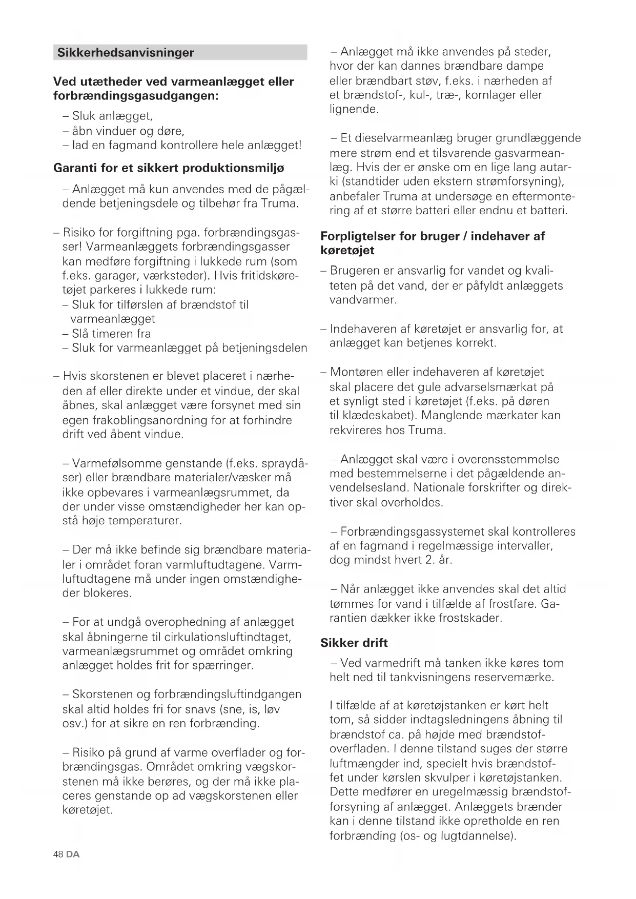 Fig. 148 DA – Anlægget må ikke anvendes på steder, hvor der kan dannes brændbare dampe eller brændbart støv, f.eks. i nærheden af et brændstof-, kul-, træ-, kornlager eller lignende. – Et dieselvarmeanlæg bruger grundlæggende mere strøm end et tilsvarende gasvarmean- læg. Hvis der er ønske om en lige lang autar- ki (standtider uden ekstern strømforsyning), anbefaler Truma at undersøge en eftermonte- ring af et større batteri eller endnu et batteri. Forpligtelser for bruger / indehaver af køretøjet – Brugeren er ansvarlig for vandet og kvali- teten på det vand, der er påfyldt anlæggets vandvarmer. – Indehaveren af køretøjet er ansvarlig for, at anlægget kan betjenes korrekt. – Montøren eller indehaveren af køretøjet skal placere det gule advarselsmærkat på et synligt sted i køretøjet (f.eks. på døren til klædeskabet). Manglende mærkater kan rekvireres hos Truma. – Anlægget skal være i overensstemmelse med bestemmelserne i det pågældende an- vendelsesland. Nationale forskrifter og direk- tiver skal overholdes. – Forbrændingsgassystemet skal kontrolleres af en fagmand i regelmæssige intervaller, dog mindst hvert 2. år. – Når anlægget ikke anvendes skal det altid tømmes for vand i tilfælde af frostfare. Ga- rantien dækker ikke frostskader. Sikker drift – Ved varmedrift må tanken ikke køres tom helt ned til tankvisningens reservemærke. I tilfælde af at køretøjstanken er kørt helt tom, så sidder indtagsledningens åbning til brændstof ca. på højde med brændstof- overfladen. I denne tilstand suges der større luftmængder ind, specielt hvis brændstof- fet under kørslen skvulper i køretøjstanken. Dette medfører en uregelmæssig brændstof- forsyning af anlægget. Anlæggets brænder kan i denne tilstand ikke opretholde en ren forbrænding (os- og lugtdannelse). Sikkerhedsanvisninger Ved utætheder ved varmeanlægget eller forbrændingsgasudgangen: – Sluk anlægget, – åbn vinduer og døre, – lad en fagmand kontrollere hele anlægget! Garanti for et sikkert produktionsmiljø – Anlægget må kun anvendes med de pågæl- dende betjeningsdele og tilbehør fra Truma. – Risiko for forgiftning pga. forbrændingsgas- ser! Varmeanlæggets forbrændingsgasser kan medføre forgiftning i lukkede rum (som f.eks. garager, værksteder). Hvis fritidskøre- tøjet parkeres i lukkede rum: – Sluk for tilførslen af brændstof til varmeanlægget – Slå timeren fra – Sluk for varmeanlægget på betjeningsdelen – Hvis skorstenen er blevet placeret i nærhe- den af eller direkte under et vindue, der skal åbnes, skal anlægget være forsynet med sin egen frakoblingsanordning for at forhindre drift ved åbent vindue. – Varmefølsomme genstande (f.eks. spraydå- ser) eller brændbare materialer/væsker må ikke opbevares i varmeanlægsrummet, da der under visse omstændigheder her kan op- stå høje temperaturer. – Der må ikke befinde sig brændbare materia- ler i området foran varmluftudtagene. Varm- luftudtagene må under ingen omstændighe- der blokeres. – For at undgå overophedning af anlægget skal åbningerne til cirkulationsluftindtaget, varmeanlægsrummet og området omkring anlægget holdes frit for spærringer. – Skorstenen og forbrændingsluftindgangen skal altid holdes fri for snavs (sne, is, løv osv.) for at sikre en ren forbrænding. – Risiko på grund af varme overflader og for- brændingsgas. Området omkring vægskor- stenen må ikke berøres, og der må ikke pla- ceres genstande op ad vægskorstenen eller køretøjet.49DA – Kontrollér, at ventilationen i køretøjet er til- strækkelig. Ved idrifttagning af anlægget kan der kortvarigt opstå røg og lugt. Dette skyl- des støv og snavs. Det er særligt tilfældet, hvis anlægget ikke har været i brug gennem længere tid. – Anlægget kan anvendes af børn fra 8 år samt af personer med nedsatte fysiske, sensoriske eller mentale evner eller manglende erfaring og viden, hvis de er under opsyn eller er ble- vet instrueret i sikker brug af anlægget, og forstår de dermed forbundne farer. Børn må ikke lege med anlægget. – Forbrændingsgasdobbeltrøret (forbrændings- gaslyddæmper- og udsugningsrør) skal regel- mæssigt kontrolleres for beskadigelse og fast tilslutning – dette gælder især efter længere køreture. Derudover skal det kontrolleres, at anlægget og skorstenen er fastgjort korrekt. Anvendelse under kørsel – Anlægget må ikke anvendes under tankning, i parkeringshuse, garager eller på færger. – Undlad at sprøjte direkte i vægskorstenen under rengøring for at undgå risiko for be- skadigelse af anlægget fra vandsprøjt. Forholdsregler ved fejl – Sluk for Combi i tilfælde af usædvanlige lyde eller lugte. – Fare for brand / eksplosion ved forsøg på at anvende et anlæg, der er blevet beskadiget pga. oversvømmelse, eller hvis køretøjet har været impliceret i en ulykke. Anlægget skal inspiceres af en fagmand og denne skal udskifte dele, der er blevet beskadiget pga. fugtighed. Det beskadigede anlæg skal evt. udskiftes med et helt nyt. – Reparationer på anlægget må kun udføres af en fagmand. – Defekter skal straks repareres af en fagmand. – Man må kun selv rette fejl, hvis fejlretningen er beskrevet i fejlfindingsvejledningen i den- ne brugsanvisning. – Efter en eksplosion (ved fejlantænding) skal anlægget og forbrændingsgasudgangen kontrolleres af en fagmand. Vedligeholdelse / reparation / rengøring – Reparationer og rengøring af anlægget må kun foretages af en fagmand. – Vedligeholdelse, reparation og rengøring må ikke foretages af børn. – Garantien bortfalder, og producenten fralæg- ger sig ethvert ansvar: – ved ændringer på anlægget (inklusive tilbehør), – ved ændring af forbrændingsgasudgang og skorsten, – hvis der ikke anvendes originale Truma-dele som reservedele og tilbehør, – hvis monterings- og brugsanvisningen ikke følges. Desuden bortfalde