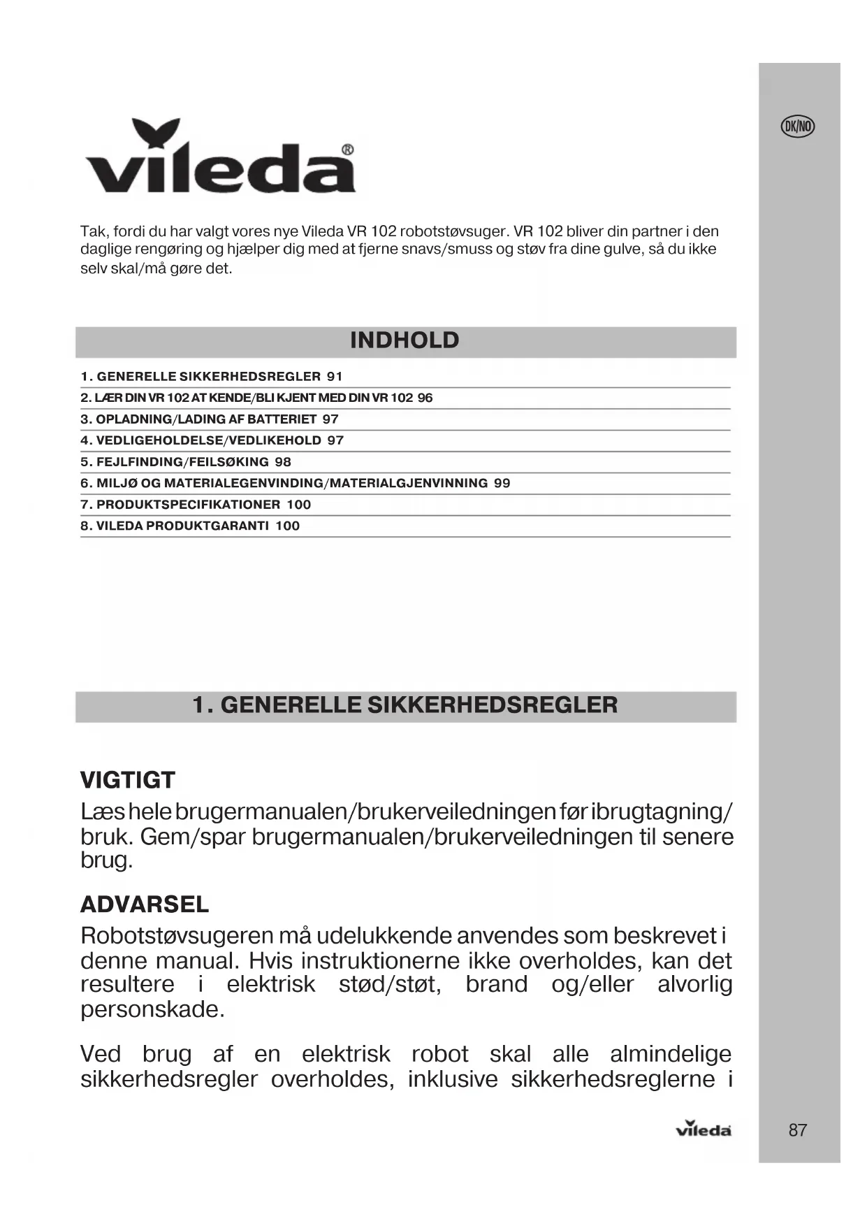 VIGTIGT Læs hele brugermanualen/brukerveiledningen før ibrugtagning/ bruk. Gem/spar brugermanualen/brukerveiledningen til senere brug. ADVARSEL Robotstøvsugeren må udelukkende anvendes som beskrevet i denne manual. Hvis instruktionerne ikke overholdes, kan det resultere i elektrisk stød/støt, brand og/eller alvorlig personskade. Ved brug af en elektrisk robot skal alle almindelige sikkerhedsregler overholdes, inklusive sikkerhedsreglerne i Tak, fordi du har valgt vores nye Vileda VR 102 robotstøvsuger. VR 102 bliver din partner i den daglige rengøring og hjælper dig med at fjerne snavs/smuss og støv fra dine gulve, så du ikke selv skal/må gøre det. INDHOLD 1. GENERELLE SIKKERHEDSREGLER 912. LÆR DIN VR 102 AT KENDE/BLI KJENT MED DIN VR 102 963. OPLADNING/LADING AF BATTERIET 974. VEDLIGEHOLDELSE/VEDLIKEHOLD 975. FEJLFINDING/FEILSØKING 986. MILJØ OG MATERIALEGENVINDING/MATERIALGJENVINNING 997. PRODUKTSPECIFIKATIONER 1008. VILEDA PRODUKTGARANTI 10088