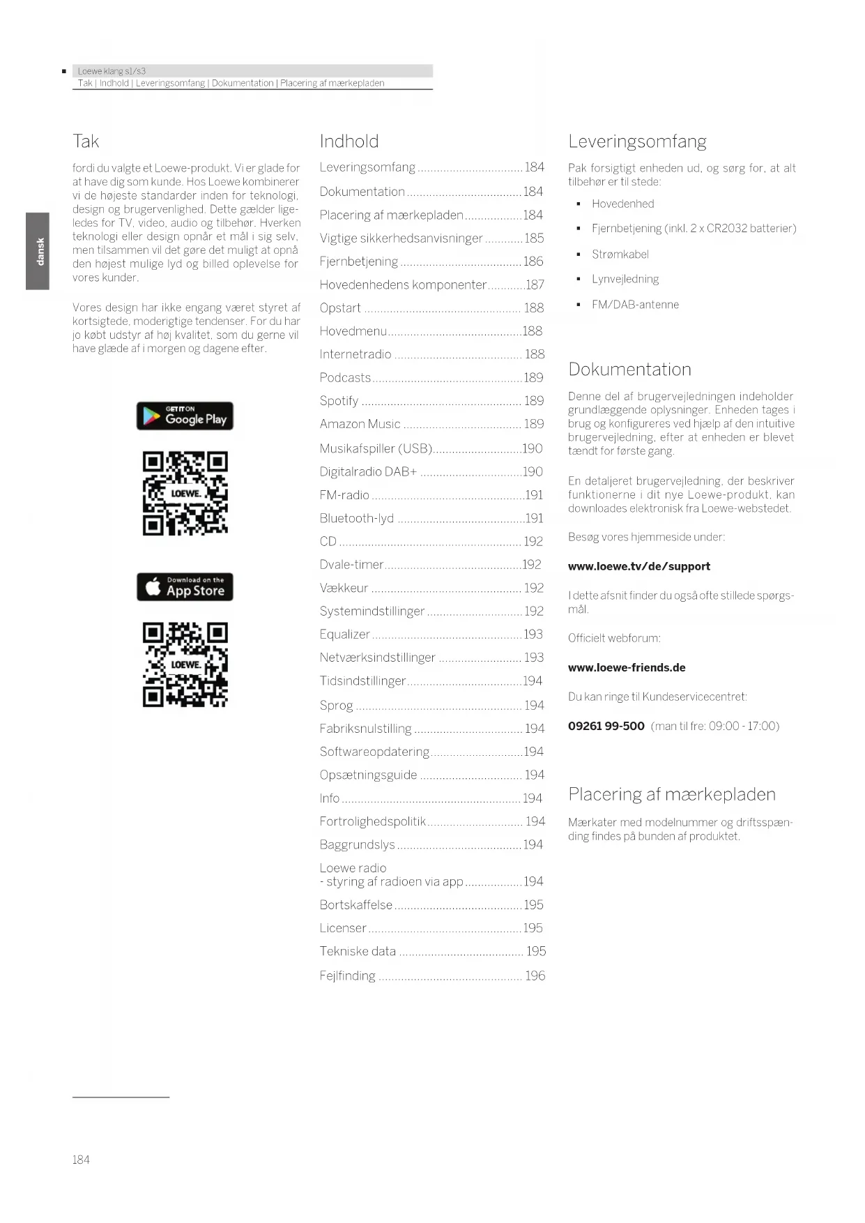 - Fejlfinding Leveringsomfang Pak forsigtigt enheden ud, og sørg for, at alt tilbehør er til stede: Hovedenhed Fjernbetjening (inkl. 2 x CR2032 batterier) Strømkabel Lynvejledning FM/DAB-antenne Dokumentation Denne del af brugervejledningen indeholder grundlæggende oplysninger. Enheden tages i brug og konfigureres ved hjælp af den intuitive brugervejledning, efter at enheden er blevet tændt for første gang. En detaljeret brugervejledning, der beskriver funktionerne i dit nye Loewe-produkt, kan downloades elektronisk fra Loewe-webstedet. Besøg vores hjemmeside under: www.loewe.tv/de/support I dette afsnit finder du også ofte stillede spørgs- mål. Officielt webforum: www.loewe-friends.de Du kan ringe til Kundeservicecentret: 09261 99-500 (man til fre: 09:00 - 17:00) Placering af mærkepladen Mærkater med modelnummer og driftsspæn- ding findes på bunden af produktet.185 p. 196