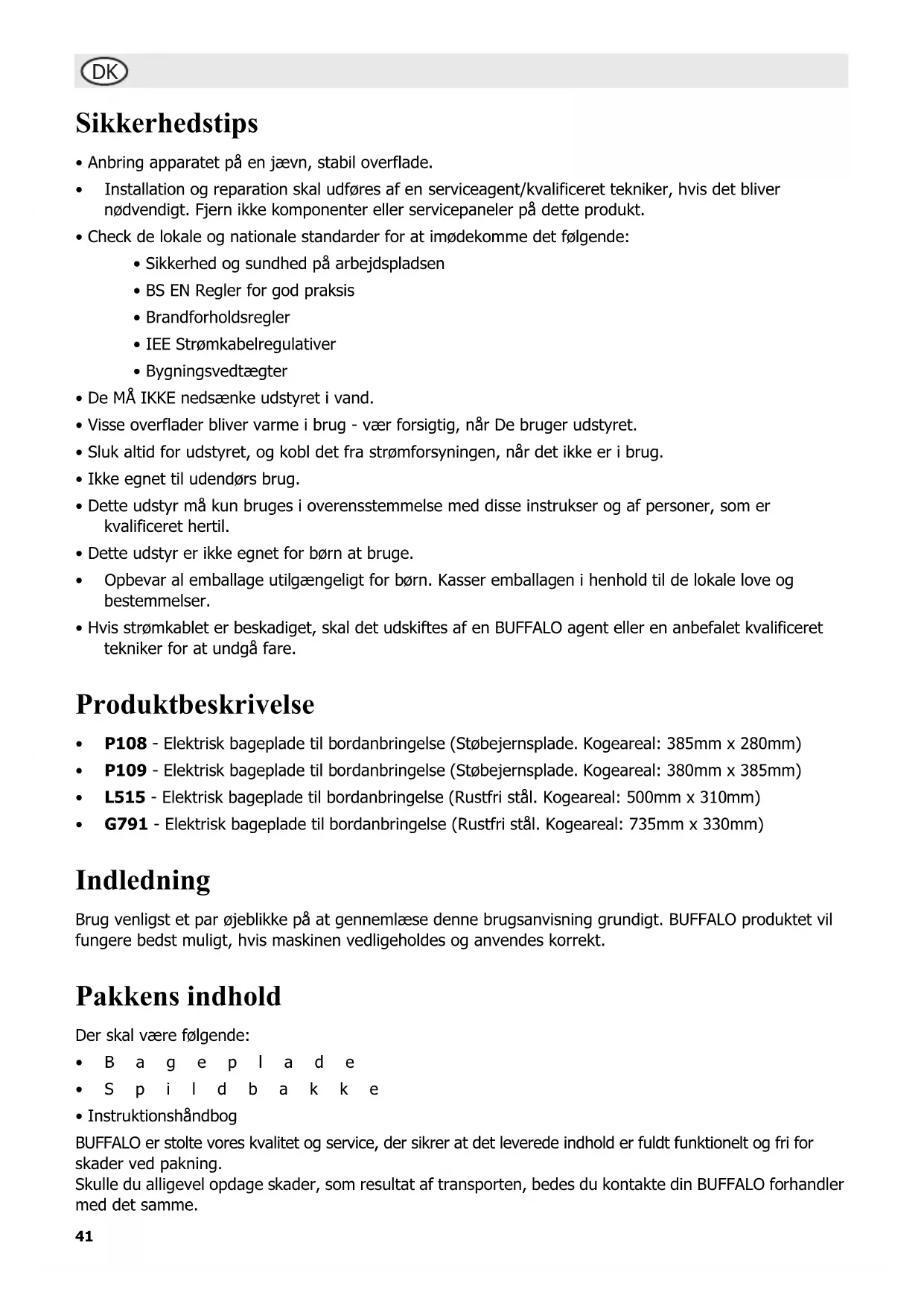 - G791 - Elektrisk bageplade til bordanbringelse (Rustfri stål. Kogeareal: 735mm x 330mm) Indledning Brug venligst et par øjeblikke på at gennemlæse denne brugsanvisning grundigt. BUFFALO produktet vil fungere bedst muligt, hvis maskinen vedligeholdes og anvendes korrekt. Pakkens indhold Der skal være følgende: