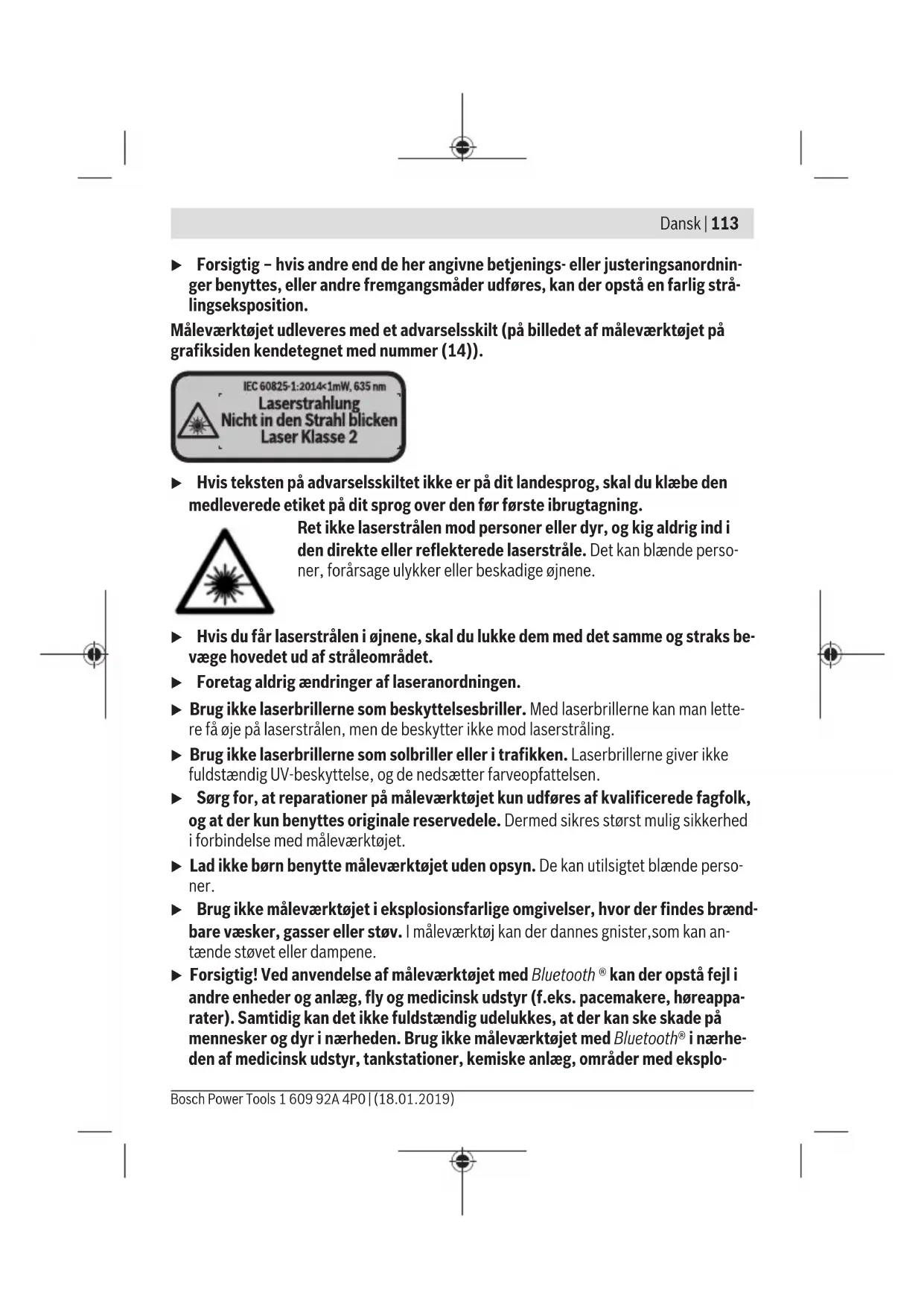 Driftsfrekvensbånd 2402–2480 MHz 2402–2480 MHz 1 609 92A 4P0 | (18.01.2019) Bosch Power ToolsDansk | 117 Digital laserafstandsmåler PLR 30 C PLR 40 C Maks. sendeeffekt 2,5 mW 2,5 mW A) Ved måling fra bagkanten af måleværktøjet. Rækkevidden bliver større, desto bedre laserlyset kastes tilbage fra målets overflade (spredende, ikke spejlende), og desto lysere laserpunktet er i forhold til den omgivende lysstyrke (inden døre, skumring). Til afstande på under 20m skal der ikke bruges retroreflekterende måltavle, da den kan føre til målefejl. B) Ved måling fra bagkanten af måleværktøjet, 100% refleksionsevne fra målet (f.eks. en hvidma- let væg), svag baggrundsbelysning og 25°C driftstemperatur. Der skal desuden påregnes en indvirkning på ±0,05mm/m. C) Der forekommer kun en ikke-ledende tilsmudsning, idet der dog lejlighedsvis må forventes en midlertidig ledeevne forårsaget af tildugning. D) afhængigt af overfladens beskaffenhed og de omgivende betingelser E) Ved 25 °C driftstemperatur F) Bluetooth® deaktiveret G) Ved Bluetooth®-Low-Energy-udstyr kan der muligvis ikke oprettes forbindelse, afhængigt af mo- del og operativsystem. Bluetooth®-udstyr skal understøtte SPP-profilen. Serienummeret (11) på typeskiltet bruges til entydig identifikation af dit måleværktøj. Montering Isætning/skift af batterier Det anbefales at bruge alkaliske manganbatterier eller akkuer til måleværktøjet. Med 1,2 V-akkuer kan man muligvis udføre færre målinger end med 1,5 V-batterier. Låget til batterirummet åbnes (9) ved at trykke låsen (10) i pilens retning og tage låget til batterirummet af. Indsæt batterierne/akkuerne. Sørg i den forbindelse for, at polerne vender rigtigt som vist på indersiden af batterirummet. Når batterisymbolet vises på displayet første gang, kan du stadig foretage mindst 100 målinger. Hvis batterisymbolet er tomt, skal batterierne/akkuerne udskiftes, og du kan ikke foretage flere målinger. Udskift altid alle batterier eller akkuer samtidigt. Brug kun batterier eller akkuer fra en og samme producent og med samme kapacitet. u Tag batterierne eller akkuerne ud af måleværktøjet, hvis det ikke skal bruges i længere tid. Batterier og akkuer kan korrodere og selvaflade ved længere tids opbe- varing. Bosch Power Tools 1 609 92A 4P0 | (18.01.2019)118 | Dansk Brug Ibrugtagning u Lad ikke det tændte måleværktøj være uden opsyn, og sluk måleværktøjet efter brug. Andre personer kan blive blændet af laserstrålen. u Beskyt måleværktøjet mod fugt og direkte sollys. u Udsæt ikke måleværktøjet for ekstreme temperaturer eller temperatursvingnin- ger. Lad det f.eks. ikke ligge i længere tid i bilen. Ved større temperatursvingninger skal måleværktøjets temperatur tilpasse sig, før det tages i brug. Ved ekstreme tem- peraturer eller temperatursvingninger kan måleværktøjets præcision påvirkes. u Udsæt ikke måleværktøjet for voldsomme stød eller fald. Hvis måleværktøjet har været udsat for kraftig ydre påvirkning, skal du foretage en nøjagtighedskontrol af det, før du fortsætter arbejdet (se "Nøjagtighedskontrol af måleværktøjet", Side124). Tænd/sluk Måleværktøjet tændes ved at trykke kort på start-stop-tasten (8) eller på måletasten (4). Når måleværktøjet tændes, er laserstrålen endnu ikke aktiveret. Måleværktøjet slukkes ved at trykke lang tid på start-stop-tasten (8). Hvis der ikke trykkes på en tast på måleværktøjet i ca. 5minutter, slukkes måleværktøjet automatisk for at skåne batterierne. Måleprocedure Når måleværktøjet er tændt, er funktionen Længdemåling aktiveret. Du kan indstille andre målefunktioner ved at trykke flere gange på ta- sten (2) (se "Målefunktioner", Side119). Efter bekræftelse af målefunktionen med måletasten (4) tændes la- serstrålen. Efter at måleværktøjet er tændt, er bagkanten af måleværktøjet valgt som referenceniveau for målingen. For skift af referenceplan, (se "Valg af referenceplan (se billederA–B)", Side119). Sæt måleværktøjet med det valgte referenceplan mod den ønskede målelinje (f.eks. væg). Tryk kort på måletasten (4) for at udløse målingen. Derefter slukkes laserstrålen. Tryk kort på måletasten (4) for at tænde laserstrålen igen. Tryk igen kort på måletasten (4) for at udløse endnu en måling. u Ret ikke laserstrålen mod personer eller dyr og ret ikke blikket ind i laserstrålen, heller ikke fra stor afstand. 1 609 92A 4P0 | (18.01.2019) Bosch Power ToolsDansk | 119 I funktionen konstant måling begynder målingen allerede efter første tryk på måletasten (4). Måleværdien vises typisk i løbet af 0,5s og senest efter 4s. Målingens varighed afhæn- ger af afstanden, lysforholdene og målfladens refleksionsegenskaber. Hvis der ikke udføres en måling i ca. 20s, efter at du har sigtet, slukkes laserstrålen auto- matisk for at skåne batterierne. Valg af referenceplan (se billederA–B) Til målingen kan du vælge mellem to forskellige referenceplan: – bagkanten af måleværktøjet (f.eks. ved anbringelse mod vægge), – forkanten af måleværktøjet (f.eks. ved måling fra en bordkant). For at skifte referenceplan skal du trykke på tasten (6), indtil det ønskede referenceplan vises på displayet. Hver gang der tændes for måleværktøjet, er måleværktøjets bagkant forindstillet som referenceplan. Målefunktioner Længdemåling Hvis du vil foretage længdemålinger, skal du trykke flere gange på tasten (2) eller trykke længe på måletasten (4), indtil du på displayet (5) ser visningen for længdemåling .