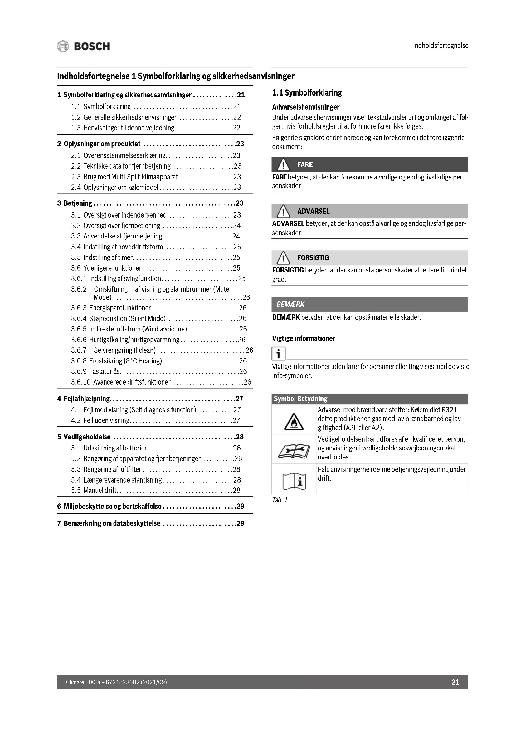 6 Miljøbeskyttelse og bortskaffelse . . . . . . . . . . . . . . . . . . . . . .29 7 Bemærkning om databeskyttelse . . . . . . . . . . . . . . . . . . . . . .29 Symbol Betydning Advarsel mod brændbare stoffer: Kølemidlet R32 i dette produkt er en gas med lav brændbarhed og lav giftighed (A2L eller A2). Vedligeholdelsen bør udføres af en kvalificeret person, og anvisninger i vedligeholdelsesvejledningen skal overholdes. Følg anvisningerne i denne betjeningsvejledning under drift.Symbolforklaring og sikkerhedsanvisninger Climate 3000i – 6721823682 (2021/09)