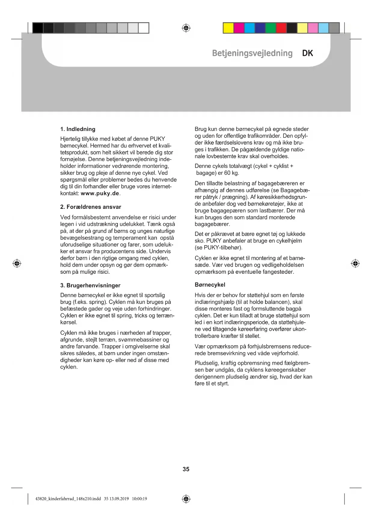 Hjertelig tillykke med købet af denne PUKY børnecykel. Hermed har du erhvervet et kvali- tetsprodukt, som helt sikkert vil berede dig stor fornøjelse. Denne betjeningsvejledning inde- holder informationer vedrørende montering, sikker brug og pleje af denne nye cykel. Ved spørgsmål eller problemer bedes du henvende dig til din forhandler eller bruge vores internet- kontakt: www.puky.de.