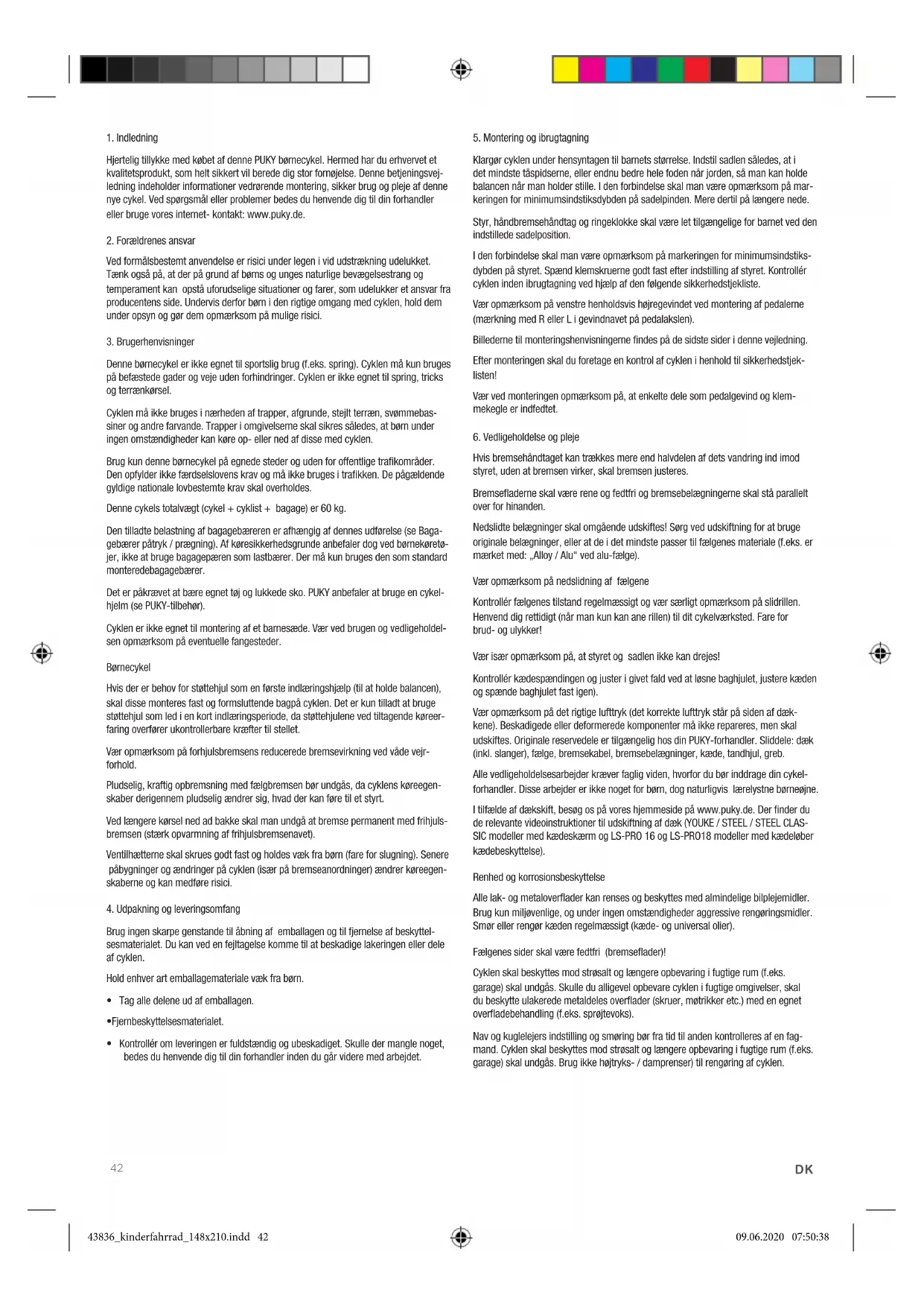 Hjertelig tillykke med købet af denne PUKY børnecykel. Hermed har du erhvervet et kvalitetsprodukt, som helt sikkert vil berede dig stor fornøjelse. Denne betjeningsvej- ledning indeholder informationer vedrørende montering, sikker brug og pleje af denne nye cykel. Ved spørgsmål eller problemer bedes du henvende dig til din forhandler eller bruge vores internet- kontakt: www.puky.de.