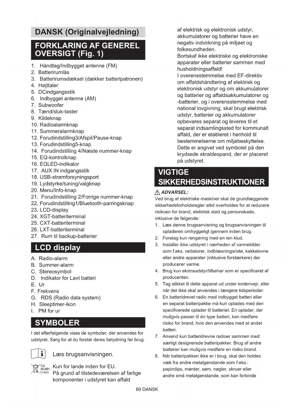 SYMBOLER I det efterfølgende vises de symboler, der anvendes for udstyret. Sørg for at du forstår deres betydning før brug. Læs brugsanvisningen. Kun for lande inden for EU. På grund af tilstedeværelsen af farlige komponenter i udstyret kan affald af elektrisk og elektronisk udstyr, akkumulatorer og batterier have en negativ indvirkning på miljøet og folkesundheden. Bortskaf ikke elektriske og elektroniske apparater eller batterier sammen med husholdningsaffald! I overensstemmelse med EF-direktiv om affaldshåndtering af elektrisk og elektronisk udstyr og om akkumulatorer og batterier og affaldsakkumulatorer og -batterier, og i overensstemmelse med national lovgivning, skal brugt elektrisk udstyr, batterier og akkumulatorer opbevares separat og leveres til et separat indsamlingssted for kommunalt affald, der er etableret i henhold til bestemmelserne om miljøbeskyttelse. Dette er angivet ved symbolet på den krydsede skraldespand, der er placeret på udstyret. VIGTIGE SIKKERHEDSINSTRUKTIONER ADVARSEL: Ved brug af elektriske maskiner skal de grundlæggende sikkerhedsforholdsregler altid overholdes for at reducere risikoen for brand, elektrisk stød og personskade, inklusive de følgende: