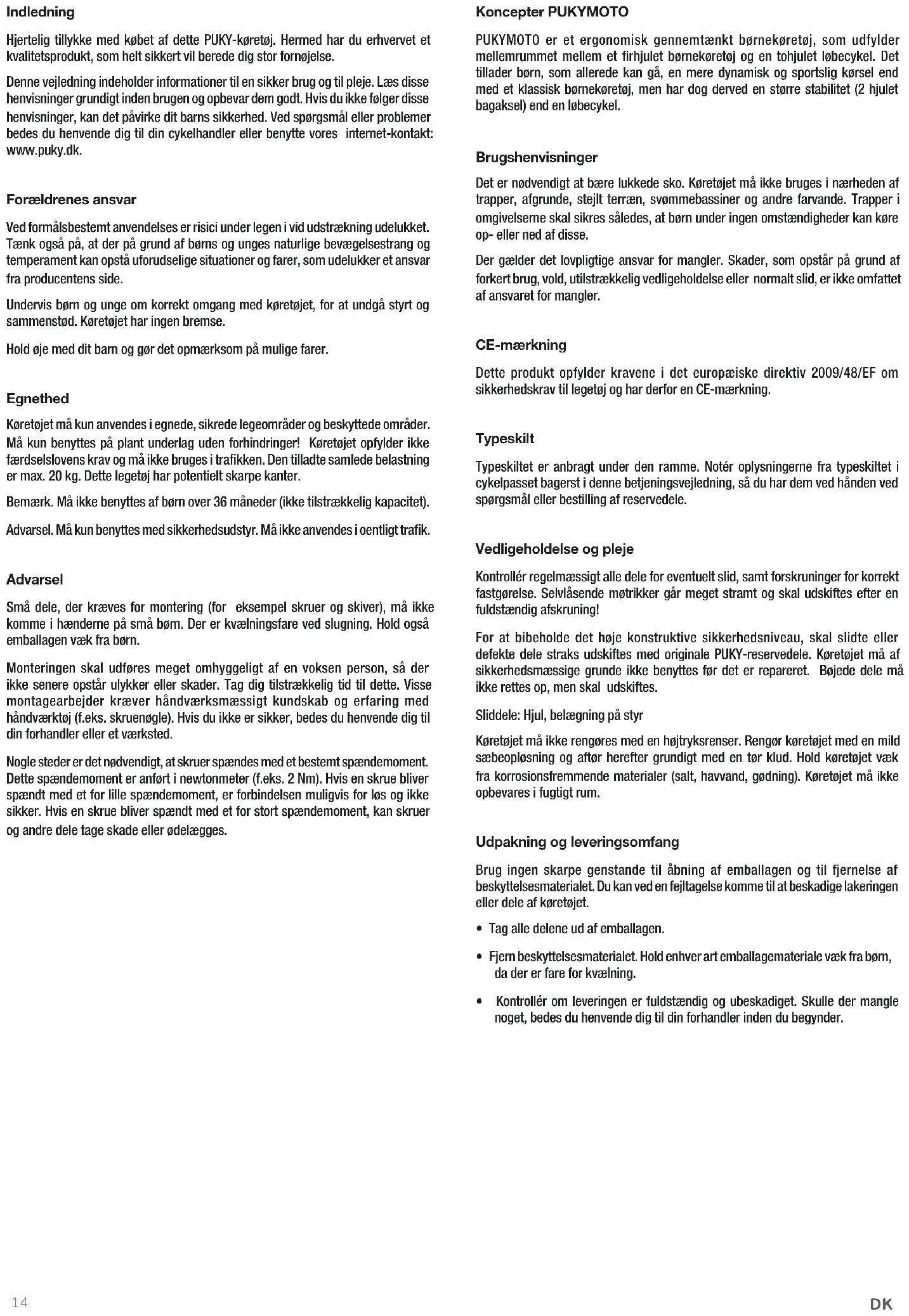 Indledning Hjertelig tillykke med købet af dette PUKY-køretøj. Hermed har du erhvervet et kvalitetsprodukt, som helt sikkert vil berede dig stor fornøjelse. Denne vejledning indeholder informationer til en sikker brug og til pleje. Læs disse henvisninger grundigt inden brugen og opbevar dem godt. Hvis du ikke følger disse henvisninger, kan det påvirke dit barns sikkerhed. Ved spørgsmål eller problemer bedes du henvende dig til din cykelhandler eller benytte vores internet-kontakt: www.puky.dk. Forældrenes ansvar Ved formålsbestemt anvendelses er risici under legen i vid udstrækning udelukket. Tænk også på, at der på grund af børns og unges naturlige bevægelsestrang og temperament kan opstå uforudselige situationer og farer, som udelukker et ansvar fra producentens side. Undervis børn og unge om korrekt omgang med køretøjet, for at undgå styrt og sammenstød. Køretøjet har ingen bremse. Hold øje med dit barn og gør det opmærksom på mulige farer. Egnethed Køretøjet må kun anvendes i egnede, sikrede legeområder og beskyttede områder. Må kun benyttes på plant underlag uden forhindringer! Køretøjet opfylder ikke færdselslovens krav og må ikke bruges i trafikken. Den tilladte samlede belastning er max. 20 kg. Dette legetøj har potentielt skarpe kanter. Bemærk. Må ikke benyttes af børn over 36 måneder (ikke tilstrækkelig kapacitet). Advarsel. Må kun benyttes med sikkerhedsudstyr. Må ikke anvendes i oentligt trafik. Advarsel Små dele, der kræves for montering (for eksempel skruer og skiver), må ikke komme i hænderne på små børn. Der er kvælningsfare ved slugning. Hold også emballagen væk fra børn. Monteringen skal udføres meget omhyggeligt af en voksen person, så der ikke senere opstår ulykker eller skader. Tag dig tilstrækkelig tid til dette. Visse montagearbejder kræver håndværksmæssigt kundskab og erfaring med håndværktøj (f.eks. skruenøgle). Hvis du ikke er sikker, bedes du henvende dig til din forhandler eller et værksted. Nogle steder er det nødvendigt, at skruer spændes med et bestemt spændemoment. Dette spændemoment er anført i newtonmeter (f.eks. 2 Nm). Hvis en skrue bliver spændt med et for lille spændemoment, er forbindelsen muligvis for løs og ikke sikker. Hvis en skrue bliver spændt med et for stort spændemoment, kan skruer og andre dele tage skade eller ødelægges. Koncepter PUKYMOTO PUKYMOTO er et ergonomisk gennemtænkt børnekøretøj, som udfylder mellemrummet mellem et firhjulet børnekøretøj og en tohjulet løbecykel. Det tillader børn, som allerede kan gå, en mere dynamisk og sportslig kørsel end med et klassisk børnekøretøj, men har dog derved en større stabilitet (2 hjulet bagaksel) end en løbecykel. Brugshenvisninger Det er nødvendigt at bære lukkede sko. Køretøjet må ikke bruges i nærheden af trapper, afgrunde, stejlt terræn, svømmebassiner og andre farvande. Trapper i omgivelserne skal sikres således, at børn under ingen omstændigheder kan køre op- eller ned af disse. Der gælder det lovpligtige ansvar for mangler. Skader, som opstår på grund af forkert brug, vold, utilstrækkelig vedligeholdelse eller normalt slid, er ikke omfattet af ansvaret for mangler. CE-mærkning Dette produkt opfylder kravene i det europæiske direktiv 2009/48/EF om sikkerhedskrav til legetøj og har derfor en CE-mærkning. Typeskilt Typeskiltet er anbragt under den ramme. Notér oplysningerne fra typeskiltet i cykelpasset bagerst i denne betjeningsvejledning, så du har dem ved hånden ved spørgsmål eller bestilling af reservedele. Vedligeholdelse og pleje Kontrollér regelmæssigt alle dele for eventuelt slid, samt forskruninger for korrekt fastgørelse. Selvlåsende møtrikker går meget stramt og skal udskiftes efter en fuldstændig afskruning! For at bibeholde det høje konstruktive sikkerhedsniveau, skal slidte eller defekte dele straks udskiftes med originale PUKY-reservedele. Køretøjet må af sikkerhedsmæssige grunde ikke benyttes før det er repareret. Bøjede dele må ikke rettes op, men skal udskiftes. Sliddele: Hjul, belægning på styr Køretøjet må ikke rengøres med en højtryksrenser. Rengør køretøjet med en mild sæbeopløsning og aftør herefter grundigt med en tør klud. Hold køretøjet væk fra korrosionsfremmende materialer (salt, havvand, gødning). Køretøjet må ikke opbevares i fugtigt rum. Udpakning og leveringsomfang Brug ingen skarpe genstande til åbning af emballagen og til fjernelse af beskyttelsesmaterialet. Du kan ved en fejltagelse komme til at beskadige lakeringen eller dele af køretøjet.