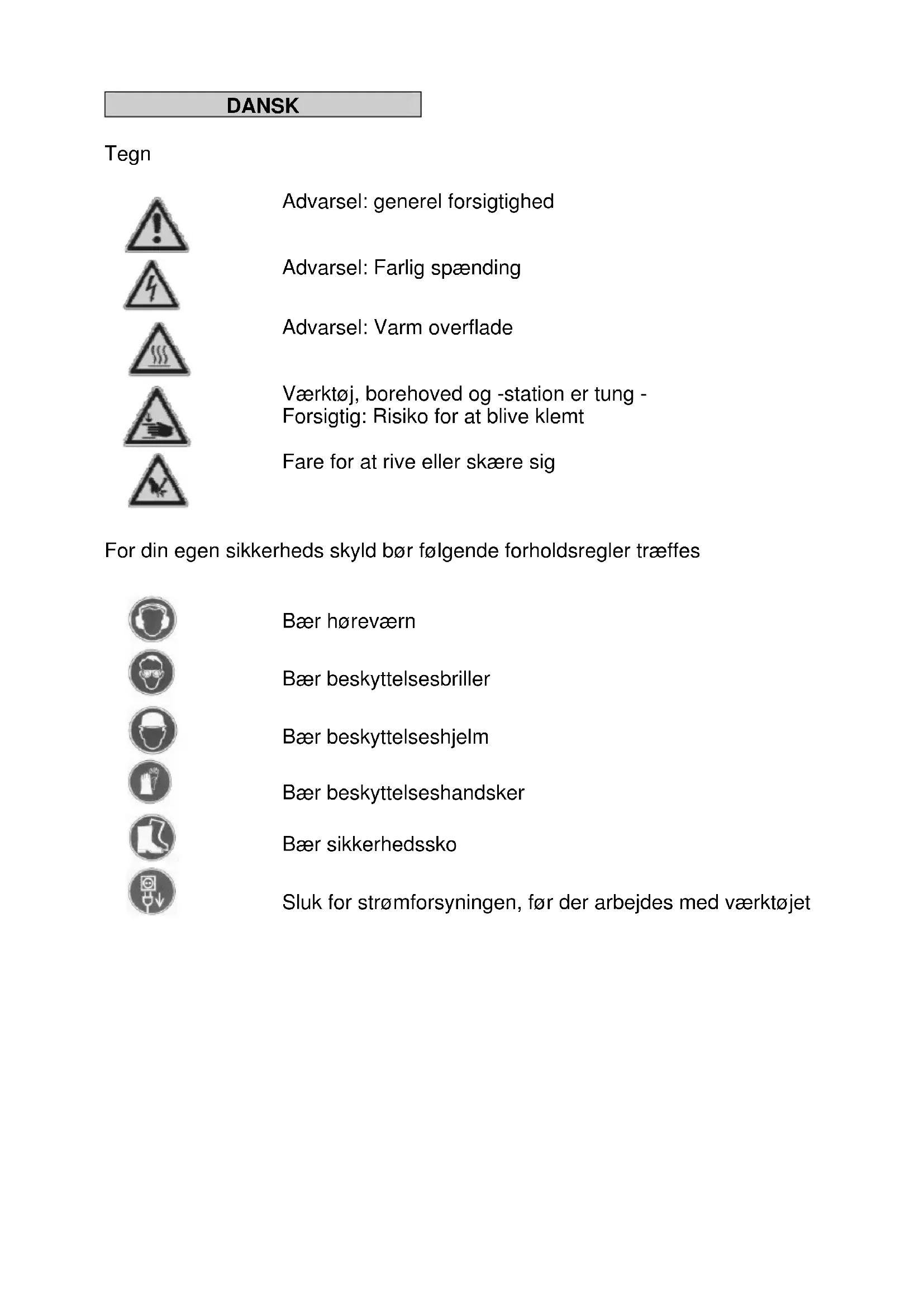 Læs disse anvisninger omhyggeligt og følg dem nøje for derved at sikre en sikkert arbejdssituation. Desuden bør de generelle sikkerhedsregler i vedlagte brochure gennemgås. Bed om en demonstration af værktøjet, før det tages i anvendelse første gang.Udfør arbejdet omhyggeligt og koncentreret. Hold arbejdsområdet rent og undgå farlige situationer