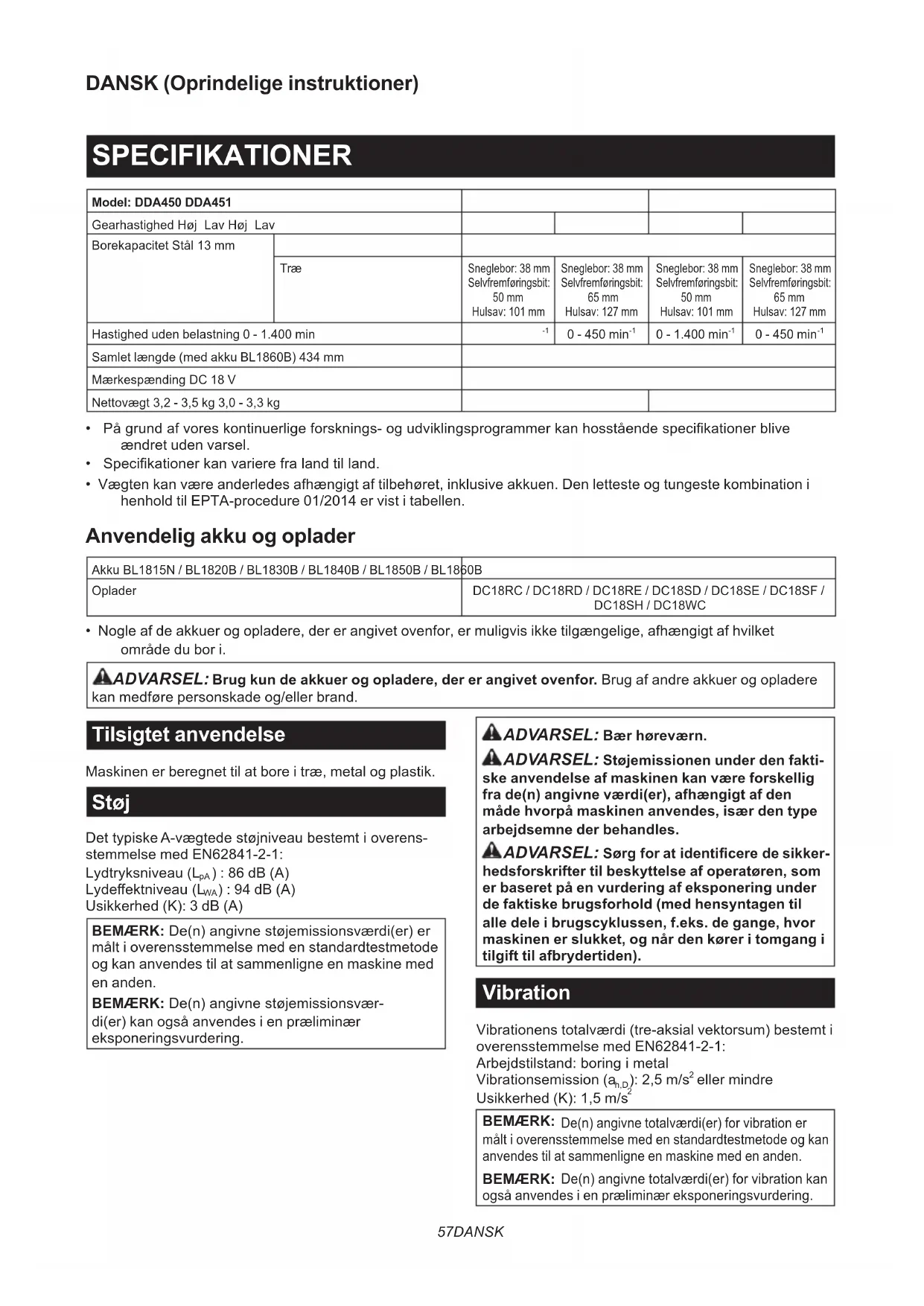 - Nogle af de akkuer og opladere, der er angivet ovenfor, er muligvis ikke tilgængelige, afhængigt af hvilket område du bor i. ADVARSEL: Brug kun de akkuer og opladere, der er angivet ovenfor. Brug af andre akkuer og opladere kan medføre personskade og/eller brand. Tilsigtet anvendelse Maskinen er beregnet til at bore i træ, metal og plastik. Støj DettypiskeA-vægtedestøjniveaubestemtioverens- stemmelse med EN62841-2-1: Lydtryksniveau (L