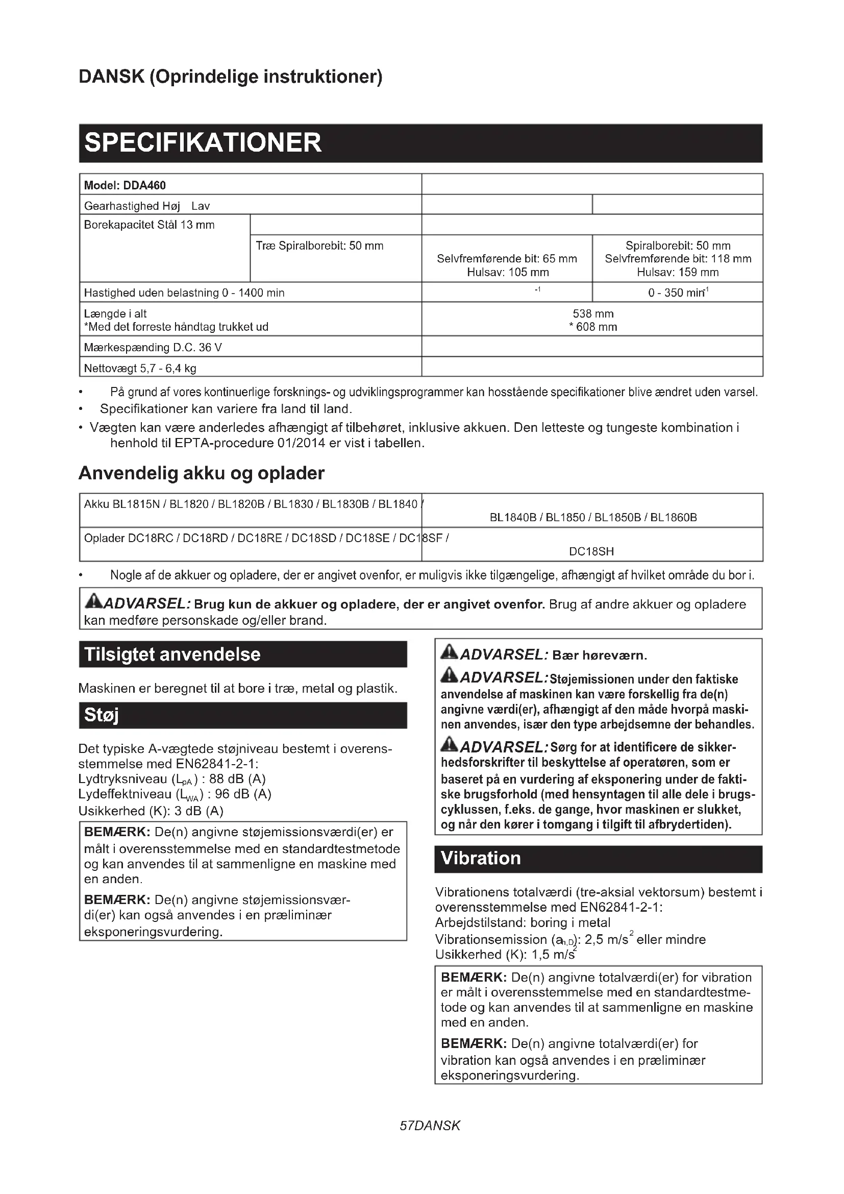 Nogle af de akkuer og opladere, der er angivet ovenfor, er muligvis ikke tilgængelige, afhængigt af hvilket område du bor i. ADVARSEL: Brug kun de akkuer og opladere, der er angivet ovenfor. Brug af andre akkuer og opladere kan medføre personskade og/eller brand. Tilsigtet anvendelse Maskinen er beregnet til at bore i træ, metal og plastik. Støj DettypiskeA-vægtedestøjniveaubestemtioverens- stemmelse med EN62841-2-1: Lydtryksniveau(L