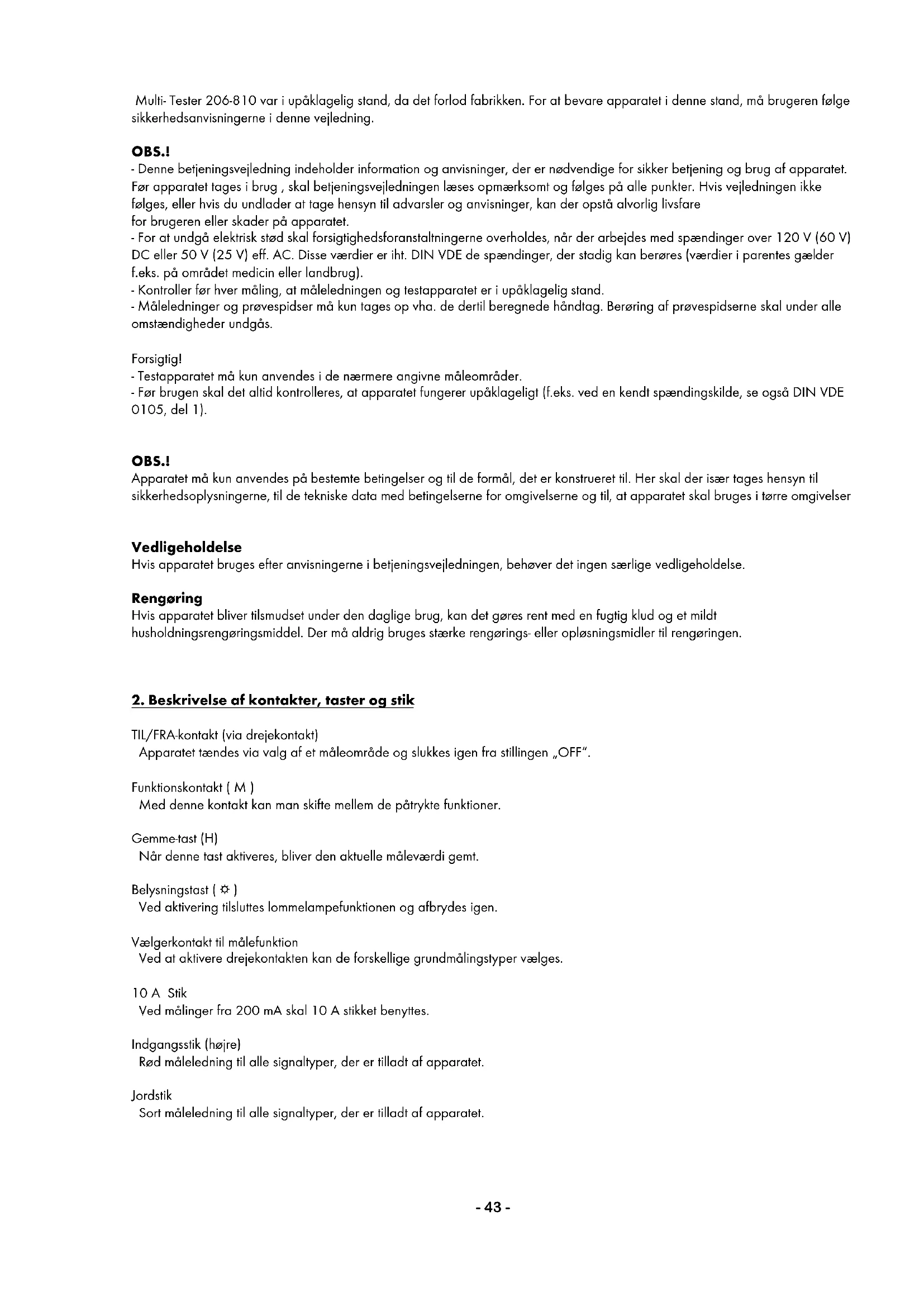 Sikkerhed iht. IEC/EN 61010 -1 / DIN VDE 0411 Leverancen omfatter: 1 stk. Multimeter Multi- Tester 206-810 inkl. sikkerhedsmåleledninger 1 stk. betjeningsvejledning 1 stk. beredskabstaske Skkerhedsforanstaltninger- 43 - Multi- Tester 206-810 var i upåklagelig stand, da det forlod fabrikken. For at bevare apparatet i denne stand, må brugeren følge sikkerhedsanvisningerne i denne vejledning.
