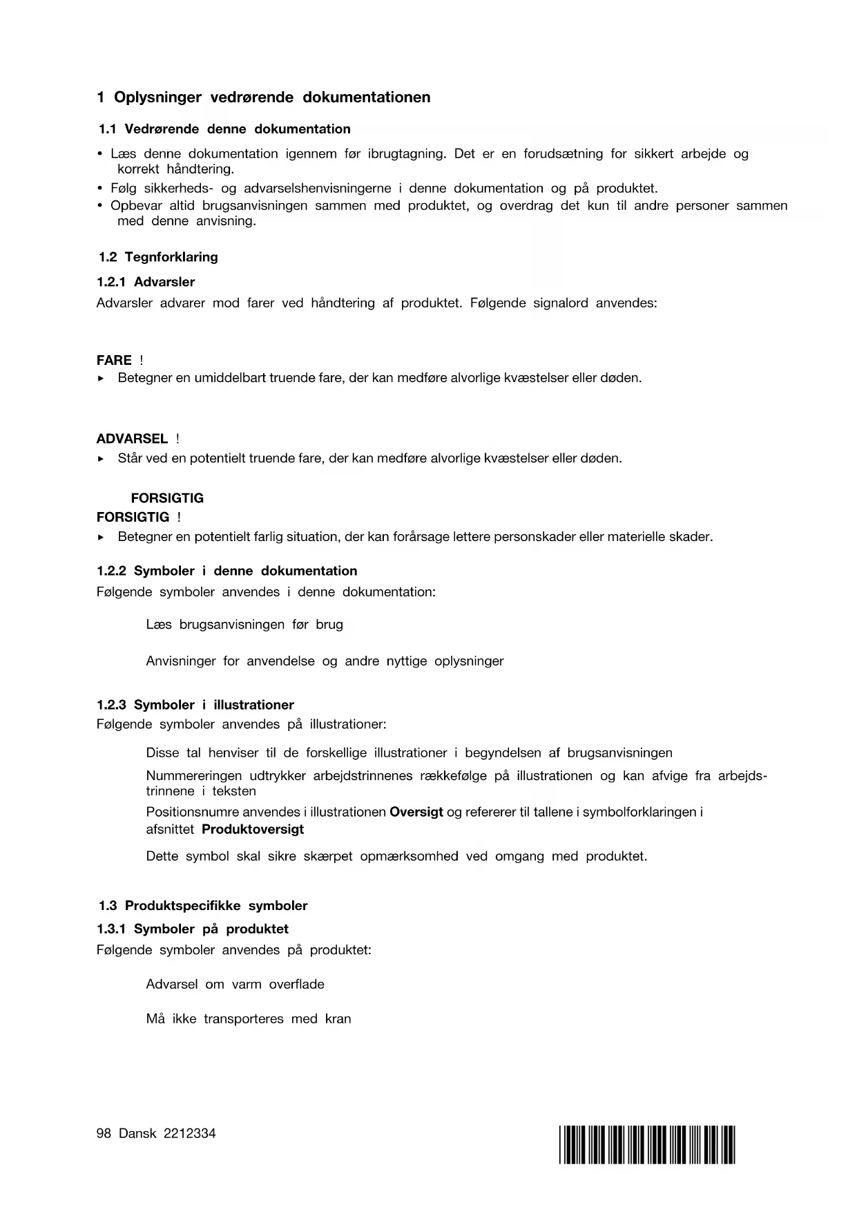 Følgende symboler anvendes på produktet: Advarsel om varm overflade Må ikke transporteres med kran*2212334* 2212334 Dansk 99