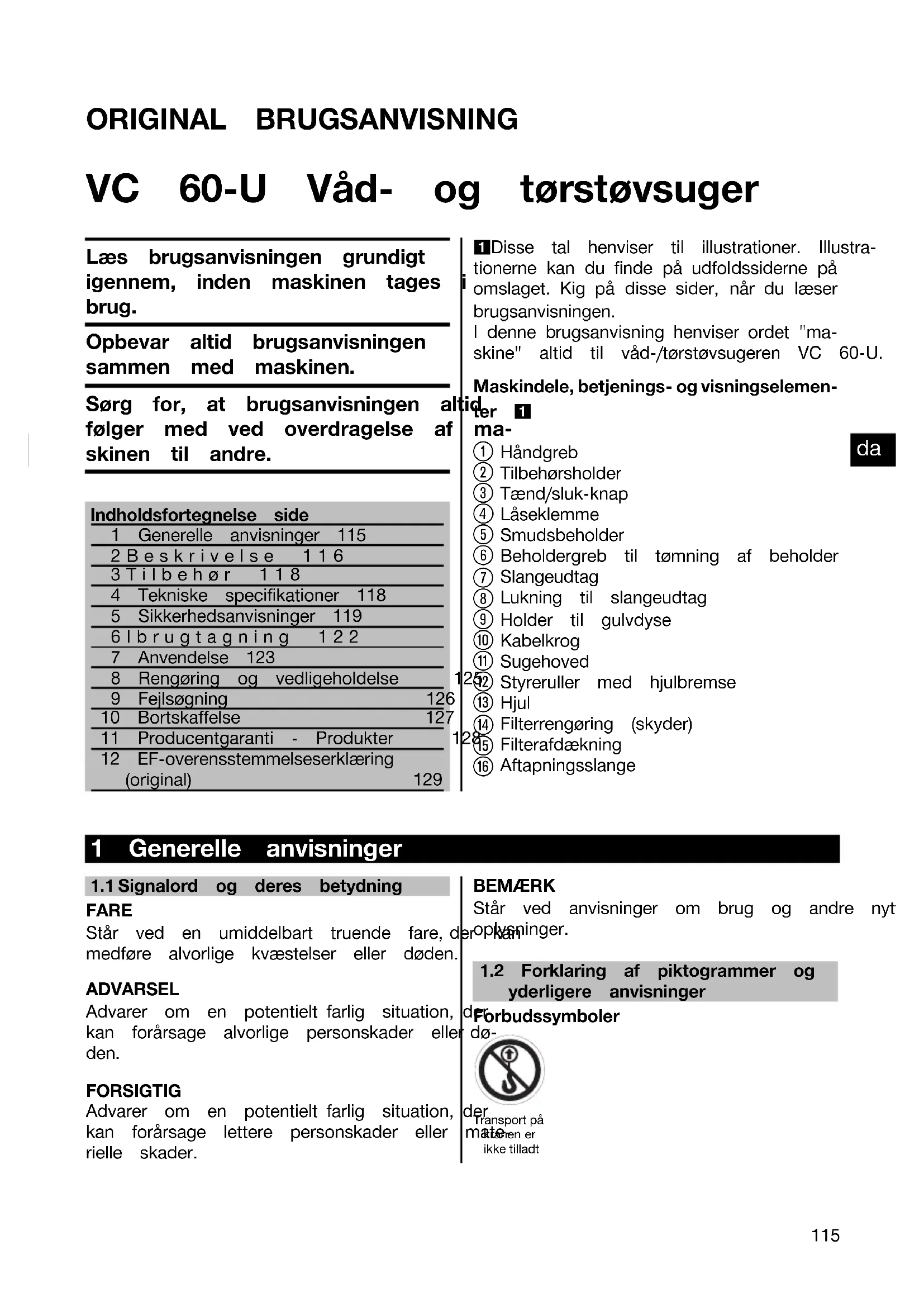 Printed: 05.12.2013 | Doc-Nr: PUB / 5071295 / 000 / 02ORIGINAL BRUGSANVISNING VC 60‑U Våd- og tørstøvsuger Læs brugsanvisningen grundigtigennem, inden maskinen tages ibrug.Opbevar altid brugsanvisningensammen med maskinen.Sørg for, at brugsanvisningen altidfølger med ved overdragelse af ma-skinen til andre.Indholdsfortegnelse side1 Generelle anvisninger 1152Beskrivelse 1163Tilbehør 1184 Tekniske specifikationer 1185 Sikkerhedsanvisninger 1196Ibrugtagning 1227 Anvendelse 1238 Rengøring og vedligeholdelse 1259 Fejlsøgning 12610 Bortskaffelse 12711 Producentgaranti - Produkter 12812 EF-overensstemmelseserklæring(original) 1291 Disse tal henviser til illustrationer. Illustra- tionerne kan du finde på udfoldssiderne på omslaget. Kig på disse sider, når du læser brugsanvisningen. I denne brugsanvisning henviser ordet "ma- skine" altid til våd-/tørstøvsugeren VC 60-U. Maskindele, betjenings- og visningselemen- ter 1 Håndgreb Tilbehørsholder Tænd/sluk-knap Låseklemme Smudsbeholder Beholdergreb til tømning af beholder Slangeudtag Lukning til slangeudtag Holder til gulvdyse Kabelkrog Sugehoved Styreruller med hjulbremse
