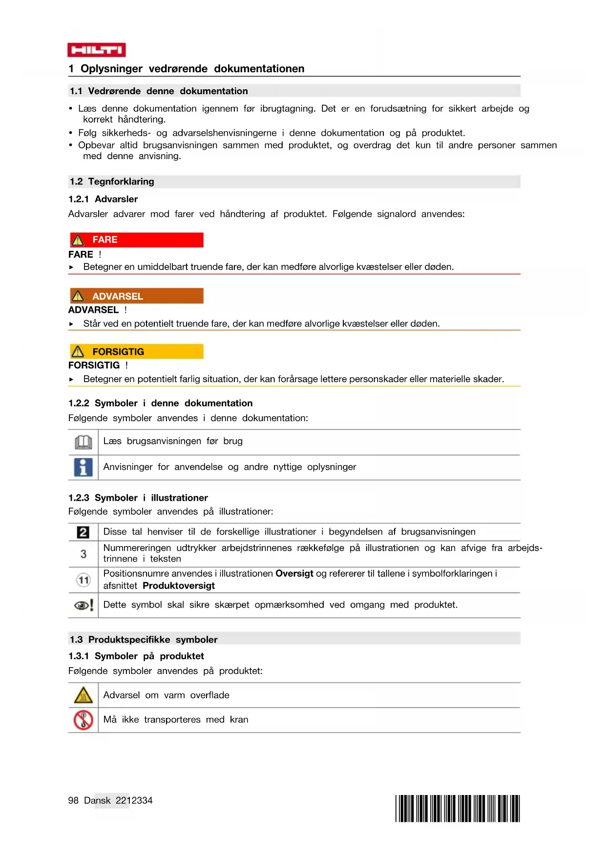 Vi erklærer som eneansvarlige, at det beskrevne produkt er i overensstemmelse med gældende direktiver og standarder. Sidst i dette dokument finder du et bilede af overensstemmelseserklæringen. Den tekniske dokumentation er arkiveret her: Hilti Entwicklungsgesellschaft mbH | Zulassung Geräte | Hiltistraße 6 | 86916 Kaufering, DE 2 Sikkerhed