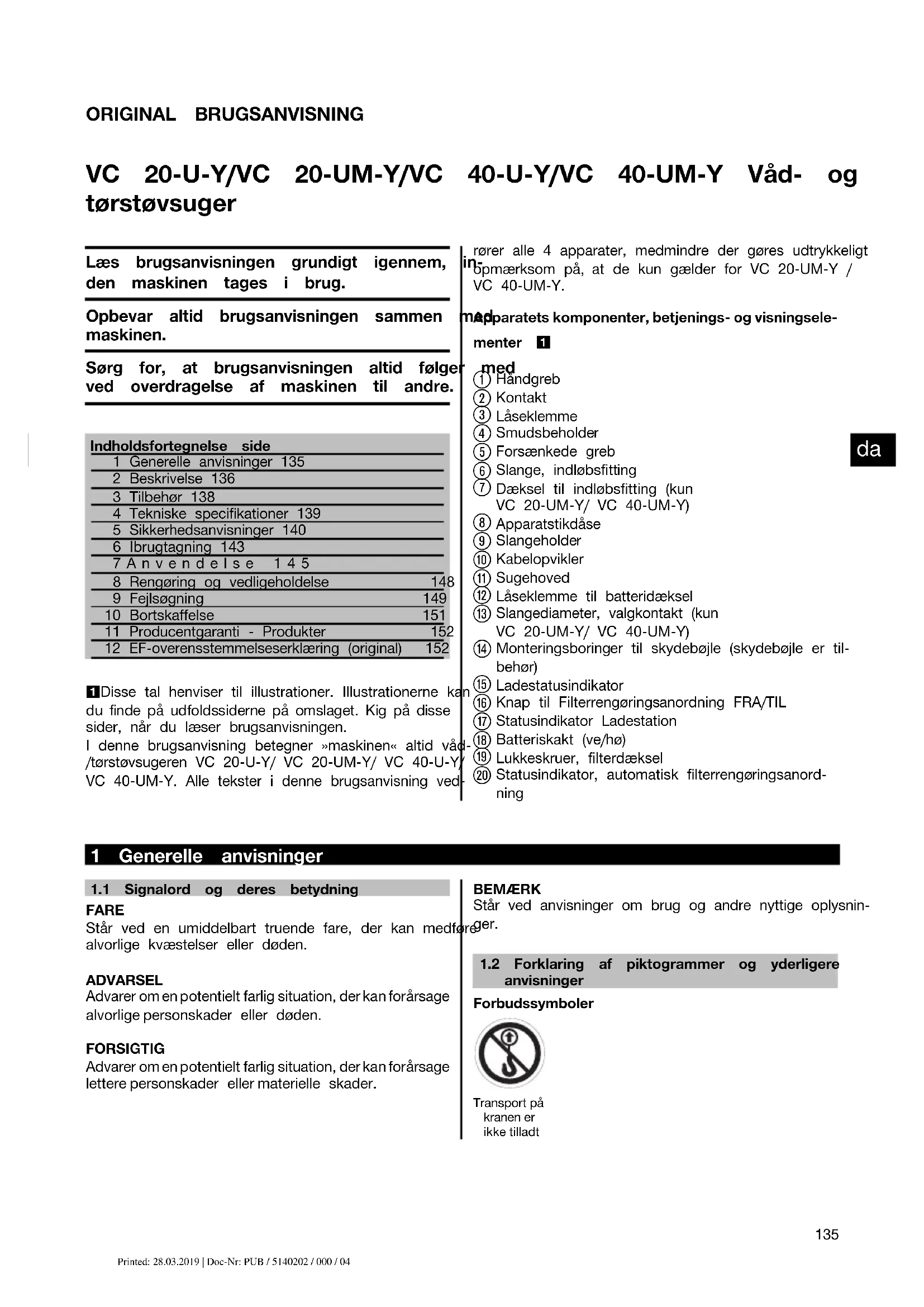Printed: 24.03.2014 | Doc-Nr: PUB / 5140202 / 000 / 03 Printed: 28.03.2019 | Doc-Nr: PUB / 5140202 / 000 / 04ORIGINAL BRUGSANVISNING VC 20-U‑Y/VC 20-UM‑Y/VC 40-U‑Y/VC 40-UM‑Y Våd- og tørstøvsuger Læs brugsanvisningen grundigt igennem, in- den maskinen tages i brug. Opbevar altid brugsanvisningen sammen med maskinen. Sørg for, at brugsanvisningen altid følger med ved overdragelse af maskinen til andre. Indholdsfortegnelse side1 Generelle anvisninger 1352 Beskrivelse 1363 Tilbehør 1384 Tekniske specifikationer 1395 Sikkerhedsanvisninger 1406 Ibrugtagning 1437Anvendelse 1458 Rengøring og vedligeholdelse 1489 Fejlsøgning 14910 Bortskaffelse 15111 Producentgaranti - Produkter 15212 EF-overensstemmelseserklæring (original) 1521 Disse tal henviser til illustrationer. Illustrationerne kan dufindepåudfoldssidernepåomslaget.Kigpådisse sider, når du læser brugsanvisningen.I denne brugsanvisning betegner »maskinen« altid våd-/tørstøvsugeren VC 20‑U‑Y/ VC 20‑UM‑Y/ VC 40‑U‑Y/VC 40‑UM‑Y. Alle tekster i denne brugsanvisning ved-rører alle 4 apparater, medmindre der gøres udtrykkeligtopmærksom på, at de kun gælder for VC 20‑UM-Y /VC 40‑UM-Y. Apparatets komponenter, betjenings- og visningsele- menter 1 Håndgreb Kontakt Låseklemme Smudsbeholder Forsænkede greb Slange, indløbsfitting Dæksel til indløbsfitting (kunVC 20‑UM‑Y/ VC 40‑UM‑Y) Apparatstikdåse Slangeholder Kabelopvikler Sugehoved Låseklemme til batteridæksel Slangediameter, valgkontakt (kunVC 20‑UM‑Y/ VC 40‑UM‑Y) Monteringsboringer til skydebøjle (skydebøjle er til-behør) Ladestatusindikator Knap til Filterrengøringsanordning FRA/TIL Statusindikator Ladestation Batteriskakt (ve/hø) Lukkeskruer, filterdæksel Statusindikator, automatisk filterrengøringsanord- ning 1 Generelle anvisninger