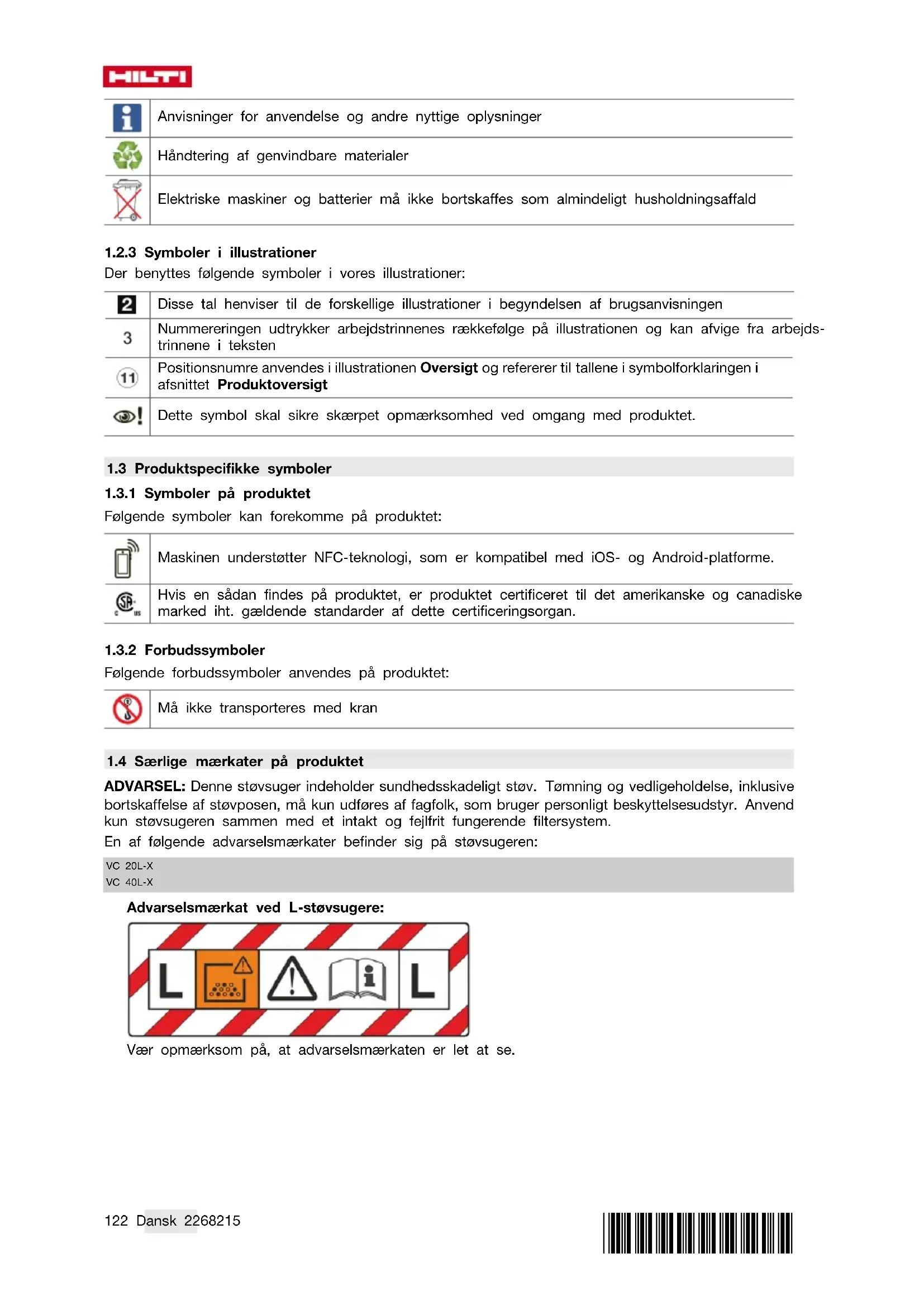 Hilti-produkter er beregnet til professionel brug og må kun betjenes, efterses og vedligeholdes af autoriseret og instrueret personale. Dette personale skal i særdeleshed informeres om de potentielle farer, der er forbundet med brugen af dette produkt. Der kan opstå farlige situationer ved anvendelse af produktet og det tilhørende udstyr, hvis det anvendes af personer, der ikke er blevet undervist i dens brug, eller hvis det ikke anvendes korrekt i henhold til forskrifterne i denne brugsanvisning. Typebetegnelse og serienummer fremgår af typeskiltet. ▶ Notér serienummeret i den efterfølgende tabel. Du skal bruge produktoplysningerne ved henvendelser til vores lokale afdeling eller vores serviceværksted. Produktoplysninger Våd- og tørstøvsuger VC 20M-X VC 20L-X VC 40M-X VC 40L-X Generation 01 Serienummer