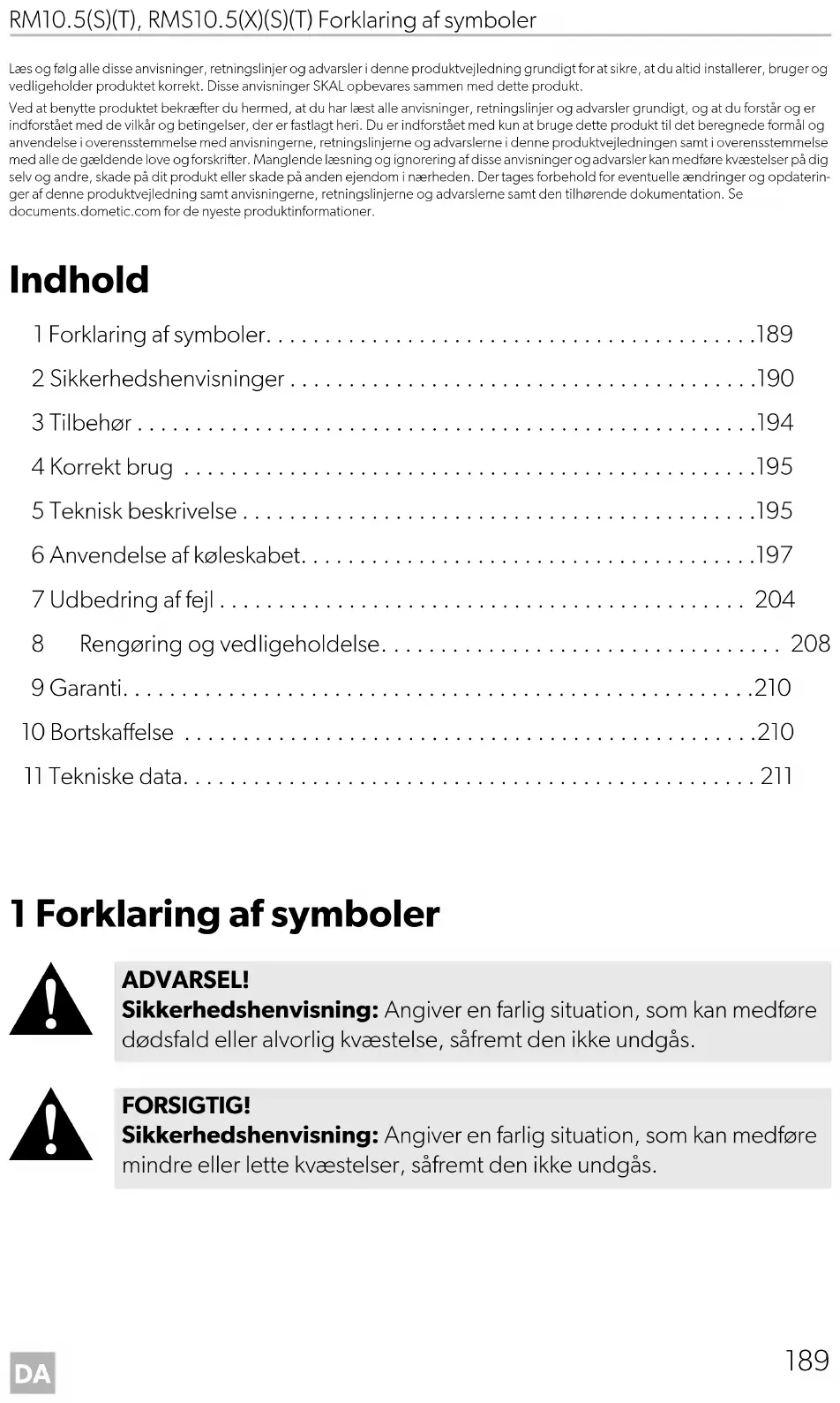 - Læs og følg alle disse anvisninger, retningslinjer og advarsler i denne produktvejledning grundigt for at sikre, at du altid installerer, bruger og vedligeholder produktet korrekt. Disse anvisninger SKAL opbevares sammen med dette produkt. Ved at benytte produktet bekræfter du hermed, at du har læst alle anvisninger, retningslinjer og advarsler grundigt, og at du forstår og er indforstået med de vilkår og betingelser, der er fastlagt heri. Du er indforstået med kun at bruge dette produkt til det beregnede formål og anvendelse i overensstemmelse med anvisningerne, retningslinjerne og advarslerne i denne produktvejledningen samt i overensstemmelse med alle de gældende love og forskrifter. Manglende læsning og ignorering af disse anvisninger og advarsler kan medføre kvæstelser på dig selv og andre, skade på dit produkt eller skade på anden ejendom i nærheden. Der tages forbehold for eventuelle ændringer og opdaterin- ger af denne produktvejledning samt anvisningerne, retningslinjerne og advarslerne samt den tilhørende dokumentation. Se documents.dometic.com for de nyeste produktinformationer. Indhold 1 Forklaring af symboler p. 189