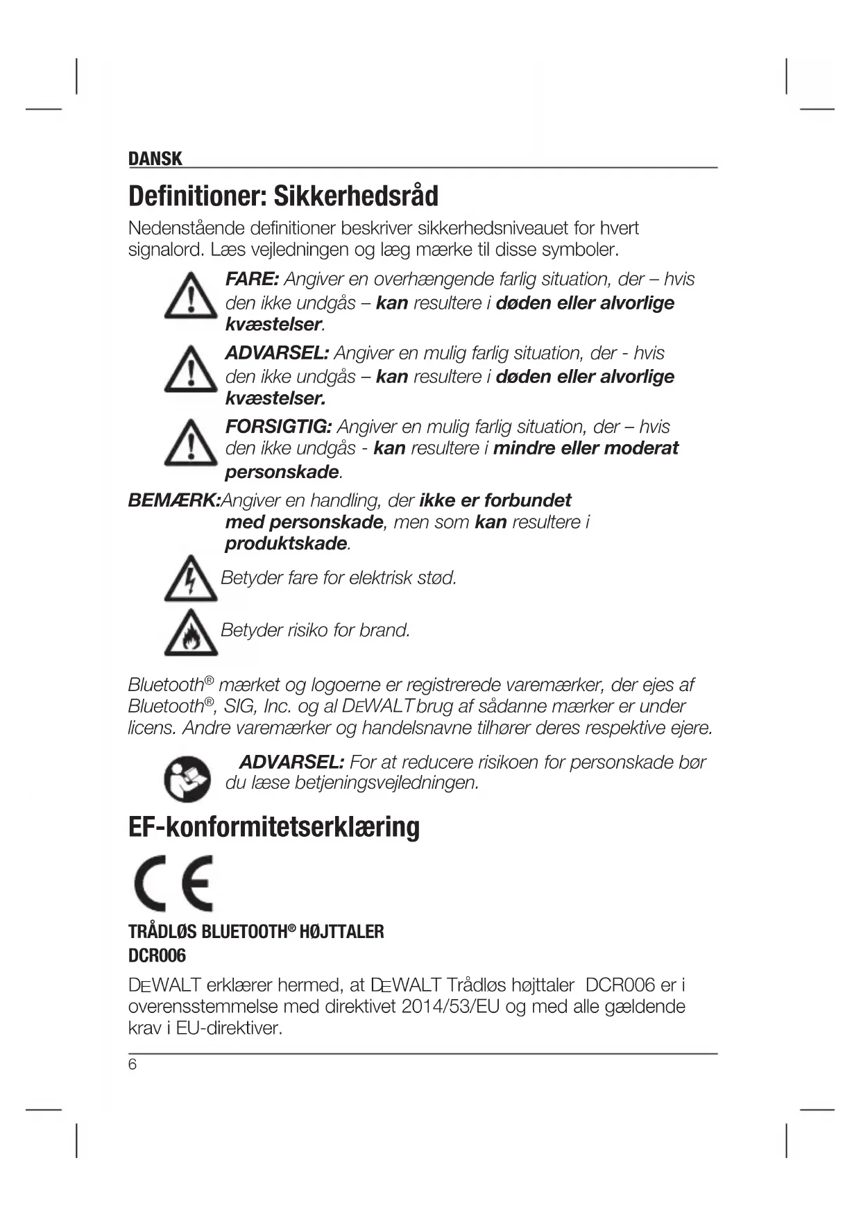 230 V Batteritype Li-Ion Ca, opladningstid af batteripakke min 40 (1,3 Ah) 45 (1,5 Ah) 60 (2,0 Ah) 90 (3,0 Ah) 120 (4,0 Ah) Vægt kg 0,366 Dansk Definitioner: Sikkerhedsråd Nedenstående definitioner beskriver sikkerhedsniveauet for hvert signalord. Læs vejledningen og læg mærke til disse symboler. FARE: Angiver en overhængende farlig situation, der – hvis den ikke undgås – kan resultere i døden eller alvorlige kvæstelser. ADVARSEL: Angiver en mulig farlig situation, der - hvis den ikke undgås – kan resultere i døden eller alvorlige kvæstelser. FORSIGTIG: Angiver en mulig farlig situation, der – hvis den ikke undgås - kan resultere i mindre eller moderat personskade. BEMÆRK: Angiver en handling, der ikke er forbundet med personskade, men som kan resultere i produktskade. Betyder fare for elektrisk stød. Betyder risiko for brand. Bluetooth