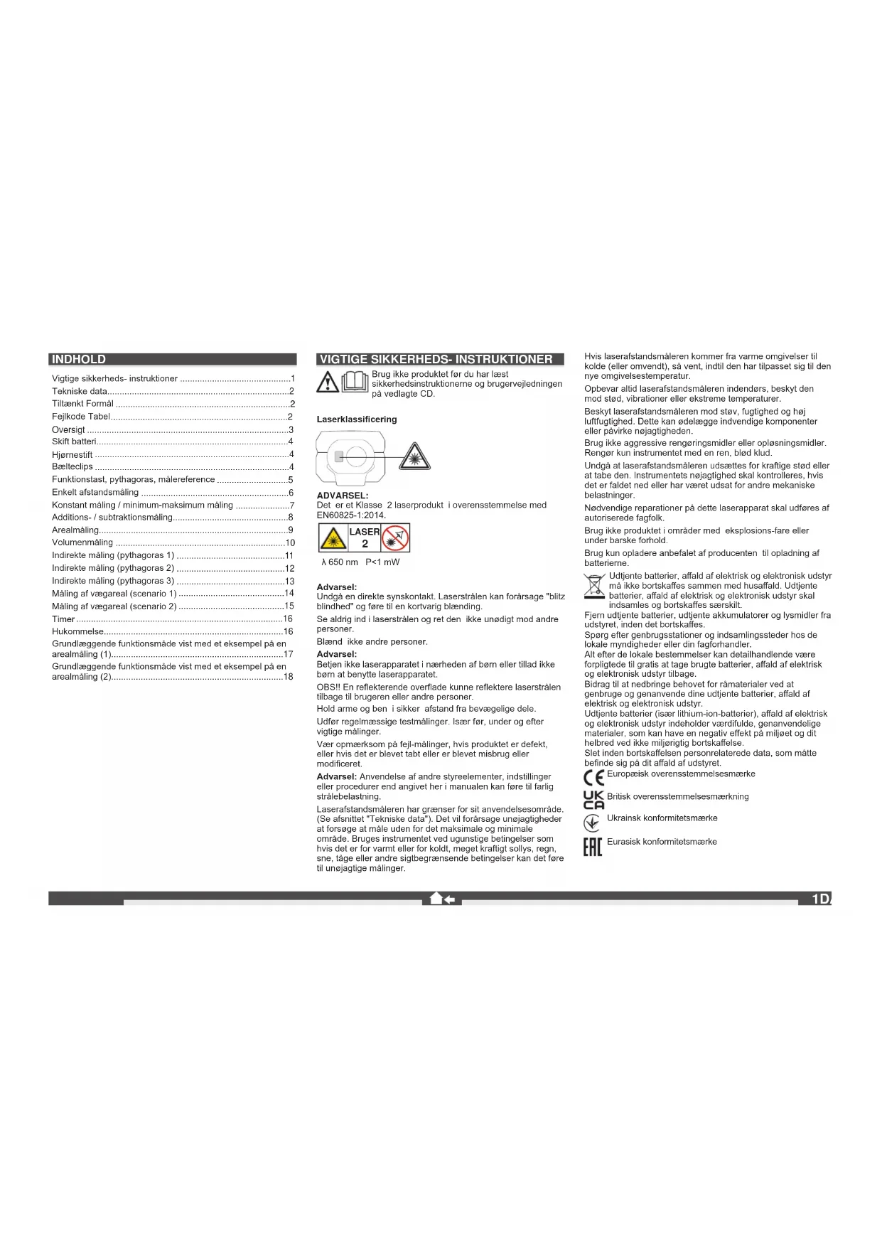 λ 650 nm P<1 mW Advarsel: Undgå en direkte synskontakt. Laserstrålen kan forårsage "blitz blindhed" og føre til en kortvarig blænding. Se aldrig ind i laserstrålen og ret den ikke unødigt mod andre personer. Blænd ikke andre personer. Advarsel: Betjen ikke laserapparatet i nærheden af børn eller tillad ikke børn at benytte laserapparatet. OBS!! En reekterende overade kunne reektere laserstrålen tilbage til brugeren eller andre personer. Hold arme og ben i sikker afstand fra bevægelige dele. Udfør regelmæssige testmålinger. Især før, under og efter vigtige målinger. Vær opmærksom på fejl-målinger, hvis produktet er defekt, eller hvis det er blevet tabt eller er blevet misbrug eller modiceret. Advarsel: Anvendelse af andre styreelementer, indstillinger eller procedurer end angivet her i manualen kan føre til farlig strålebelastning. Laserafstandsmåleren har grænser for sit anvendelsesområde. (Se afsnittet "Tekniske data"). Det vil forårsage unøjagtigheder at forsøge at måle uden for det maksimale og minimale område. Bruges instrumentet ved ugunstige betingelser som hvis det er for varmt eller for koldt, meget kraftigt sollys, regn, sne, tåge eller andre sigtbegrænsende betingelser kan det føre til unøjagtige målinger. Hvis laserafstandsmåleren kommer fra varme omgivelser til kolde (eller omvendt), så vent, indtil den har tilpasset sig til den nye omgivelsestemperatur. Opbevar altid laserafstandsmåleren indendørs, beskyt den mod stød, vibrationer eller ekstreme temperaturer. Beskyt laserafstandsmåleren mod støv, fugtighed og høj luftfugtighed. Dette kan ødelægge indvendige komponenter eller påvirke nøjagtigheden. Brug ikke aggressive rengøringsmidler eller opløsningsmidler. Rengør kun instrumentet med en ren, blød klud. Undgå at laserafstandsmåleren udsættes for kraftige stød eller at tabe den. Instrumentets nøjagtighed skal kontrolleres, hvis det er faldet ned eller har været udsat for andre mekaniske belastninger. Nødvendige reparationer på dette laserapparat skal udføres af autoriserede fagfolk. Brug ikke produktet i områder med eksplosions-fare eller under barske forhold. Brug kun opladere anbefalet af producenten til opladning af batterierne. Udtjente batterier, aald af elektrisk og elektronisk udstyr må ikke bortskaes sammen med husaald. Udtjente batterier, aald af elektrisk og elektronisk udstyr skal indsamles og bortskaes særskilt. Fjern udtjente batterier, udtjente akkumulatorer og lysmidler fra udstyret, inden det bortskaes. Spørg efter genbrugsstationer og indsamlingssteder hos de lokale myndigheder eller din fagforhandler. Alt efter de lokale bestemmelser kan detailhandlende være forpligtede til gratis at tage brugte batterier, aald af elektrisk og elektronisk udstyr tilbage. Bidrag til at nedbringe behovet for råmaterialer ved at genbruge og genanvende dine udtjente batterier, aald af elektrisk og elektronisk udstyr. Udtjente batterier (især lithium-ion-batterier), aald af elektrisk og elektronisk udstyr indeholder værdifulde, genanvendelige materialer, som kan have en negativ eekt på miljøet og dit helbred ved ikke miljørigtig bortskaelse. Slet inden bortskaelsen personrelaterede data, som måtte bende sig på dit aald af udstyret. Europæisk overensstemmelsesmærke Britisk overensstemmelsesmærkning Ukrainsk konformitetsmærke Eurasisk konformitetsmærke INDHOLD Vigtige sikkerheds- instruktioner .............................................1 Tekniske data..........................................................................2 Tiltænkt Formål