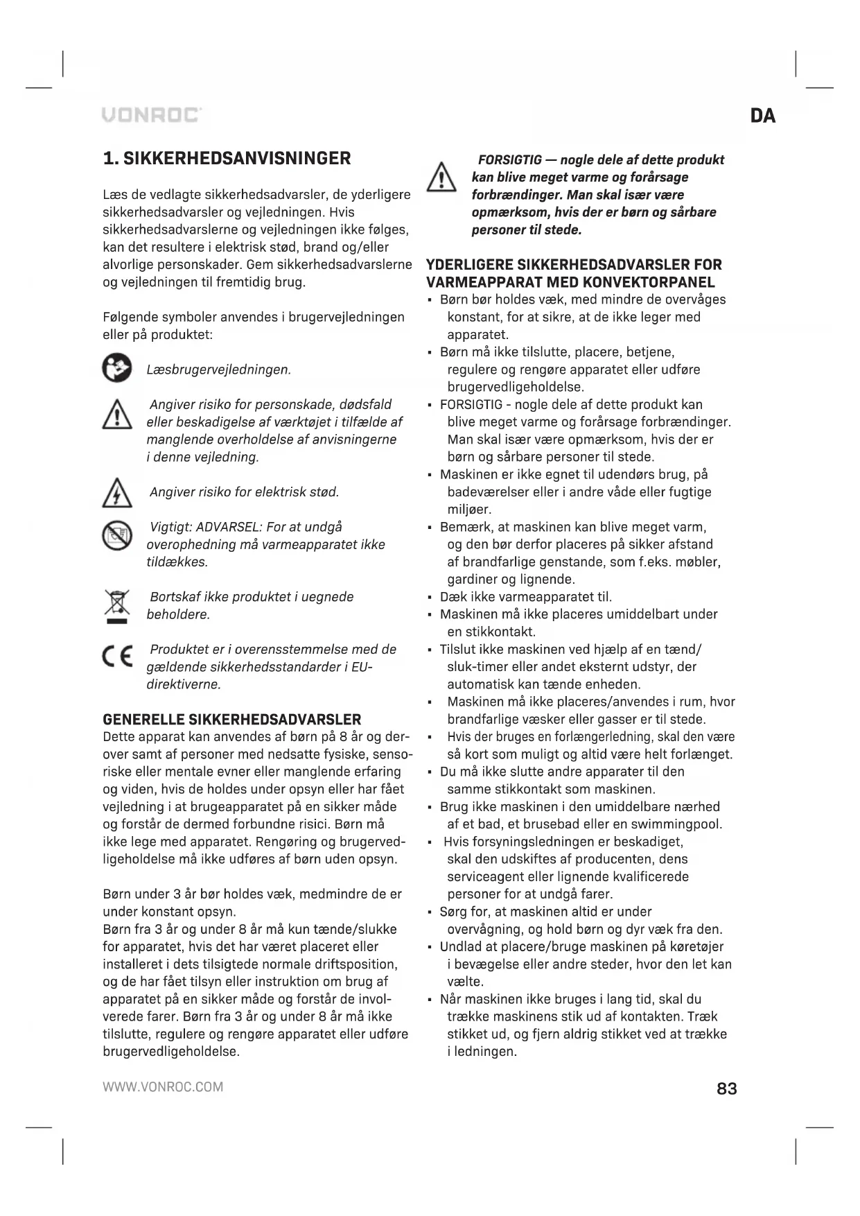 Læs de vedlagte sikkerhedsadvarsler, de yderligere sikkerhedsadvarsler og vejledningen. Hvis sikkerhedsadvarslerne og vejledningen ikke følges, kan det resultere ielektrisk stød, brand og/eller alvorlige personskader. Gem sikkerhedsadvarslerne og vejledningen til fremtidig brug. Følgende symboler anvendes ibrugervejledningen eller på produktet: Læs brugervejledningen. Angiver risiko for personskade, dødsfald eller beskadigelse af værktøjet itilfælde af manglende overholdelse af anvisningerne idenne vejledning. Angiver risiko for elektrisk stød. Vigtigt: ADVARSEL: For at undgå overophedning må varmeapparatet ikke tildækkes. Bortskaf ikke produktet iuegnede beholdere. Produktet er ioverensstemmelse med de gældende sikkerhedsstandarder iEU- direktiverne. GENERELLE SIKKERHEDSADVARSLER Dette apparat kan anvendes af børn på 8 år og der- over samt af personer med nedsatte fysiske, senso- riske eller mentale evner eller manglende erfaring og viden, hvis de holdes under opsyn eller har fået vejledning i at brugeapparatet på en sikker måde og forstår de dermed forbundne risici. Børn må ikke lege med apparatet. Rengøring og brugerved- ligeholdelse må ikke udføres af børn uden opsyn. Børn under 3 år bør holdes væk, medmindre de er under konstant opsyn. Børn fra 3 år og under 8 år må kun tænde/slukke for apparatet, hvis det har været placeret eller installeret i dets tilsigtede normale driftsposition, og de har fået tilsyn eller instruktion om brug af apparatet på en sikker måde og forstår de invol- verede farer. Børn fra 3 år og under 8 år må ikke tilslutte, regulere og rengøre apparatet eller udføre brugervedligeholdelse. FORSIGTIG — nogle dele af dette produkt kan blive meget varme og forårsage forbrændinger. Man skal især være opmærksom, hvis der er børn og sårbare personer til stede.