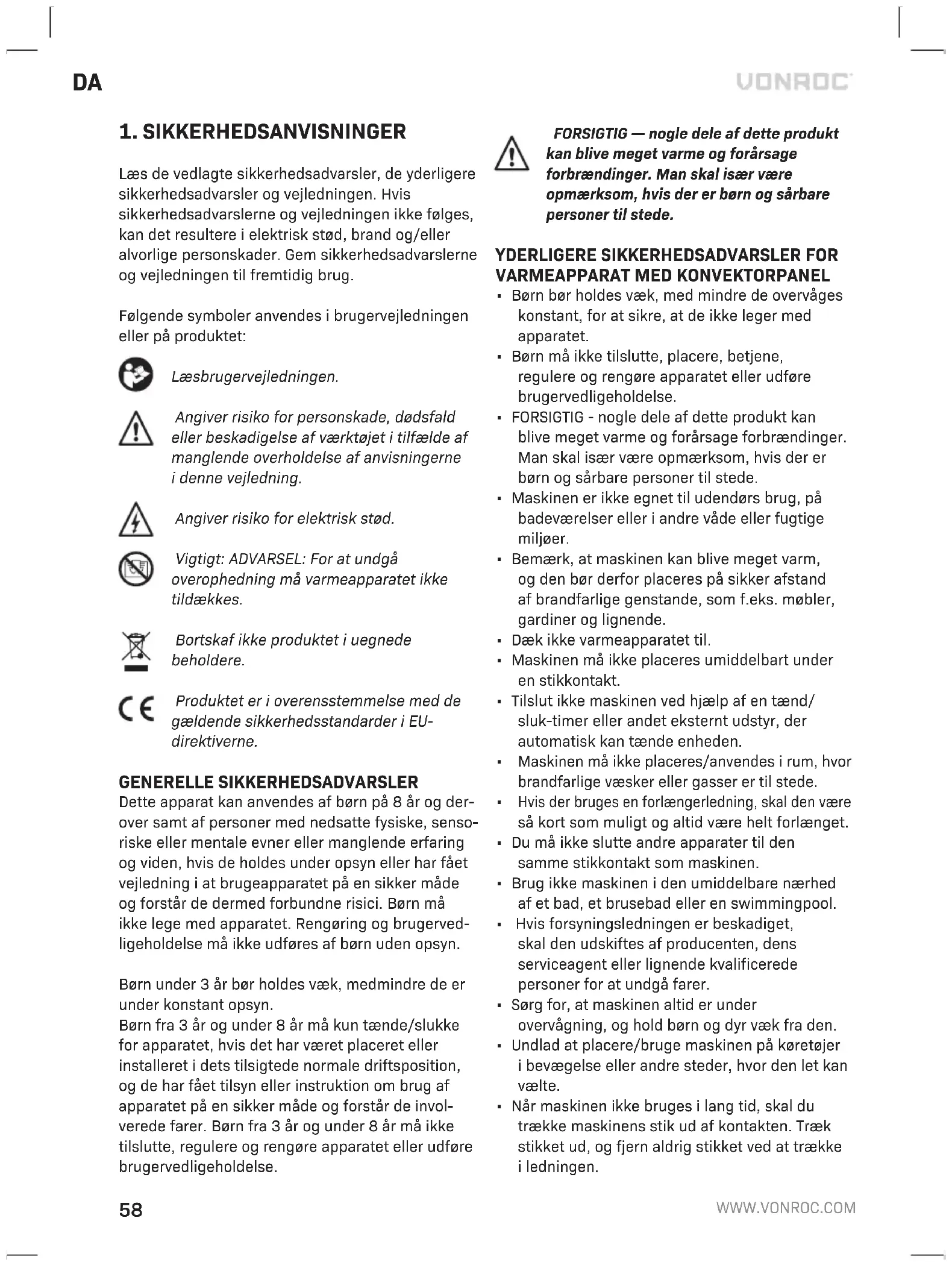 Læs de vedlagte sikkerhedsadvarsler, de yderligere sikkerhedsadvarsler og vejledningen. Hvis sikkerhedsadvarslerne og vejledningen ikke følges, kan det resultere ielektrisk stød, brand og/eller alvorlige personskader. Gem sikkerhedsadvarslerne og vejledningen til fremtidig brug. Følgende symboler anvendes ibrugervejledningen eller på produktet: Læs brugervejledningen. Angiver risiko for personskade, dødsfald eller beskadigelse af værktøjet itilfælde af manglende overholdelse af anvisningerne idenne vejledning. Angiver risiko for elektrisk stød. Vigtigt: ADVARSEL: For at undgå overophedning må varmeapparatet ikke tildækkes. Bortskaf ikke produktet iuegnede beholdere. Produktet er ioverensstemmelse med de gældende sikkerhedsstandarder iEU- direktiverne. GENERELLE SIKKERHEDSADVARSLER Dette apparat kan anvendes af børn på 8 år og der- over samt af personer med nedsatte fysiske, senso- riske eller mentale evner eller manglende erfaring og viden, hvis de holdes under opsyn eller har fået vejledning i at brugeapparatet på en sikker måde og forstår de dermed forbundne risici. Børn må ikke lege med apparatet. Rengøring og brugerved- ligeholdelse må ikke udføres af børn uden opsyn. Børn under 3 år bør holdes væk, medmindre de er under konstant opsyn. Børn fra 3 år og under 8 år må kun tænde/slukke for apparatet, hvis det har været placeret eller installeret i dets tilsigtede normale driftsposition, og de har fået tilsyn eller instruktion om brug af apparatet på en sikker måde og forstår de invol- verede farer. Børn fra 3 år og under 8 år må ikke tilslutte, regulere og rengøre apparatet eller udføre brugervedligeholdelse. FORSIGTIG — nogle dele af dette produkt kan blive meget varme og forårsage forbrændinger. Man skal især være opmærksom, hvis der er børn og sårbare personer til stede.