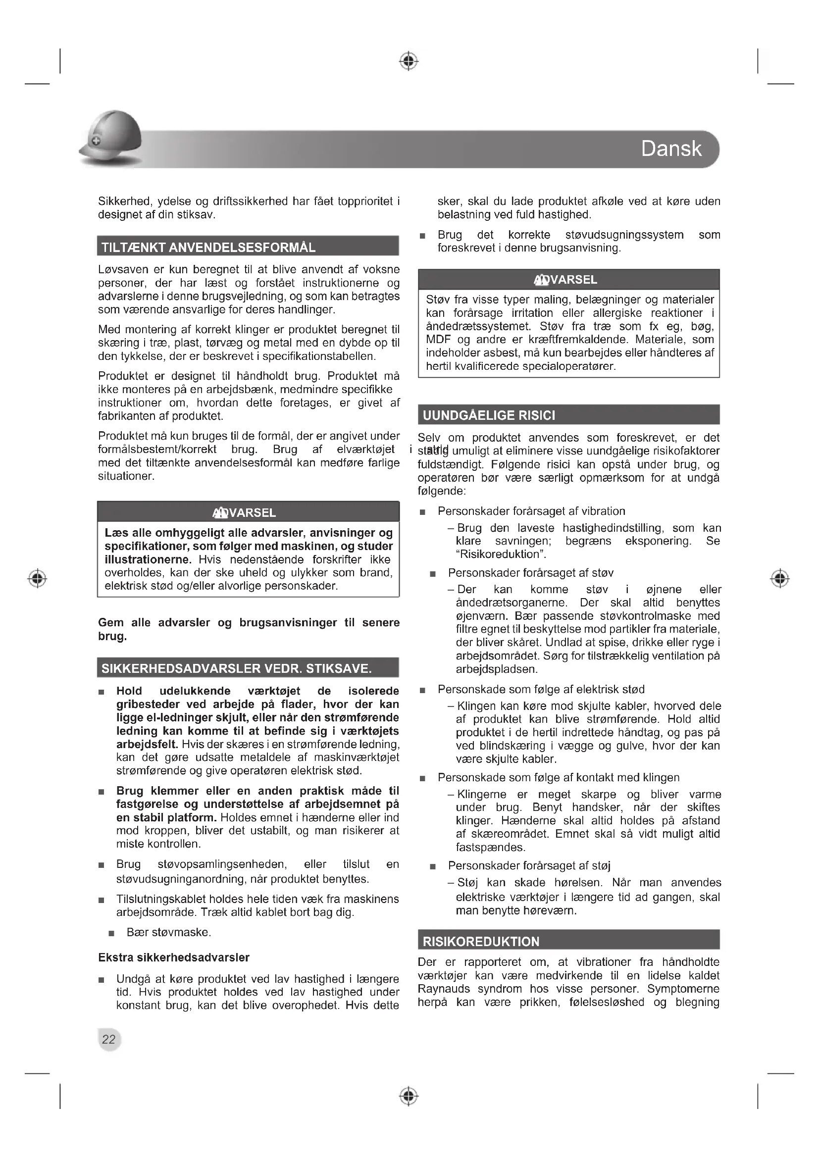 Selv om produktet anvendes som foreskrevet, er det stadig umuligt at eliminere visse uundgåelige risikofaktorer fuldstændigt. Følgende risici kan opstå under brug, og operatøren bør være særligt opmærksom for at undgå følgende: Ŷ Personskader forårsaget af vibration – Brug den laveste hastighedindstilling, som kan klare savningen; begræns eksponering. Se “Risikoreduktion”. Ŷ Personskader forårsaget af støv – Der kan komme støv i øjnene eller åndedrætsorganerne. Der skal altid benyttes øjenværn. Bær passende støvkontrolmaske med filtre egnet til beskyttelse mod partikler fra materiale, der bliver skåret. Undlad at spise, drikke eller ryge i arbejdsområdet. Sørg for tilstrækkelig ventilation på arbejdspladsen. Ŷ Personskade som følge af elektrisk stød – Klingen kan køre mod skjulte kabler, hvorved dele af produktet kan blive strømførende. Hold altid produktet i de hertil indrettede håndtag, og pas på ved blindskæring i vægge og gulve, hvor der kan være skjulte kabler. Ŷ Personskade som følge af kontakt med klingen – Klingerne er meget skarpe og bliver varme under brug. Benyt handsker, når der skiftes klinger. Hænderne skal altid holdes på afstand af skæreområdet. Emnet skal så vidt muligt altid fastspændes. Ŷ Personskader forårsaget af støj – Støj kan skade hørelsen. Når man anvendes elektriske værktøjer i længere tid ad gangen, skal man benytte høreværn. RISIKOREDUKTION Der er rapporteret om, at vibrationer fra håndholdte værktøjer kan være medvirkende til en lidelse kaldet Raynauds syndrom hos visse personer. Symptomerne herpå kan være prikken, følelsesløshed og blegningDansk