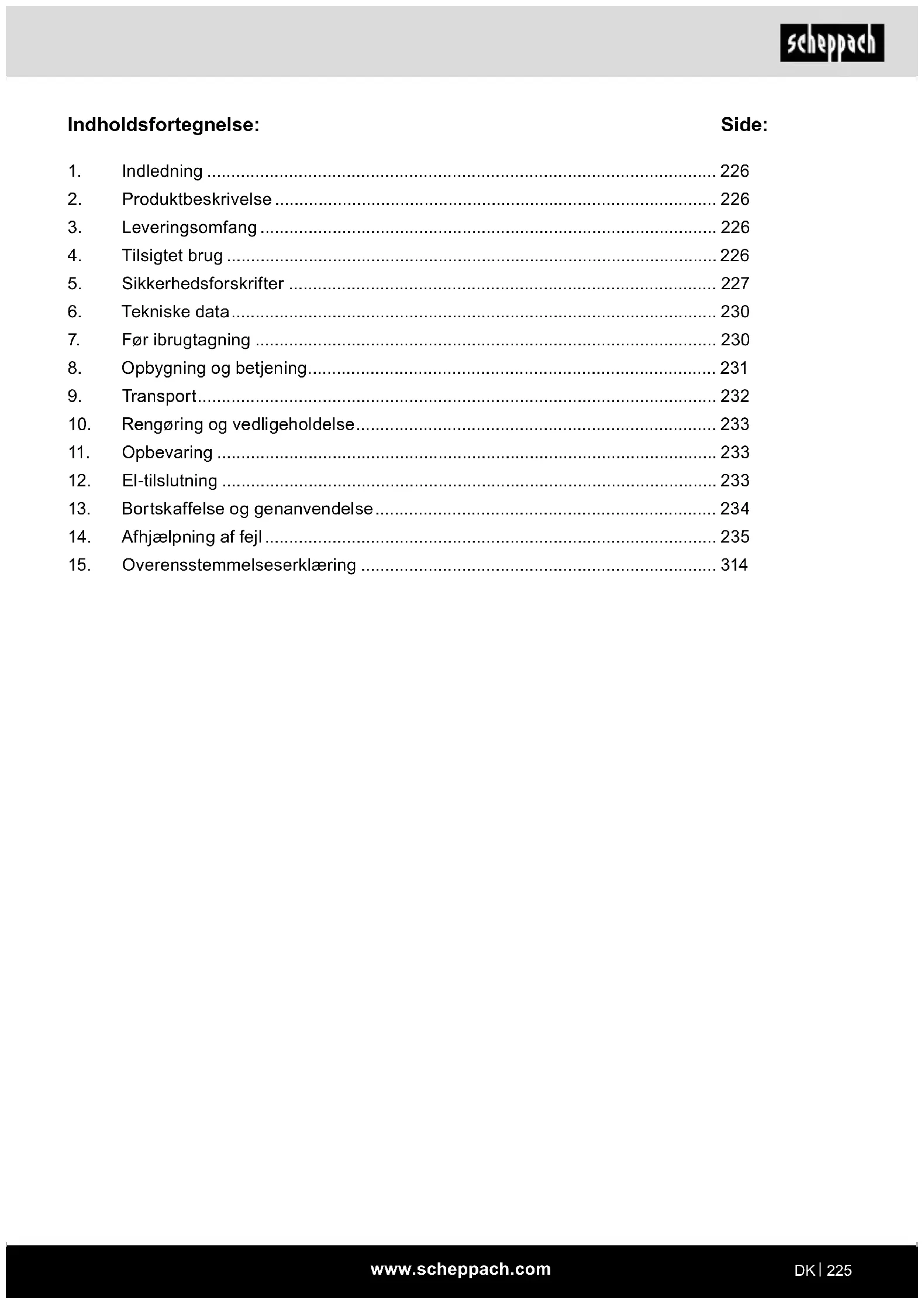 Producent: Scheppach GmbH Günzburger Straße 69 D-89335 Ichenhausen Kære kunde, Vi ønsker dig rigtig god fornøjelse og held og lykke med arbejdet med dit nye apparat. Bemærk: Iht. den gældende lov om produktansvar hæfter pro- ducenten af denne maskine ikke for skader, der opstår på eller i forbindelse med denne maskine i forbindelse med: